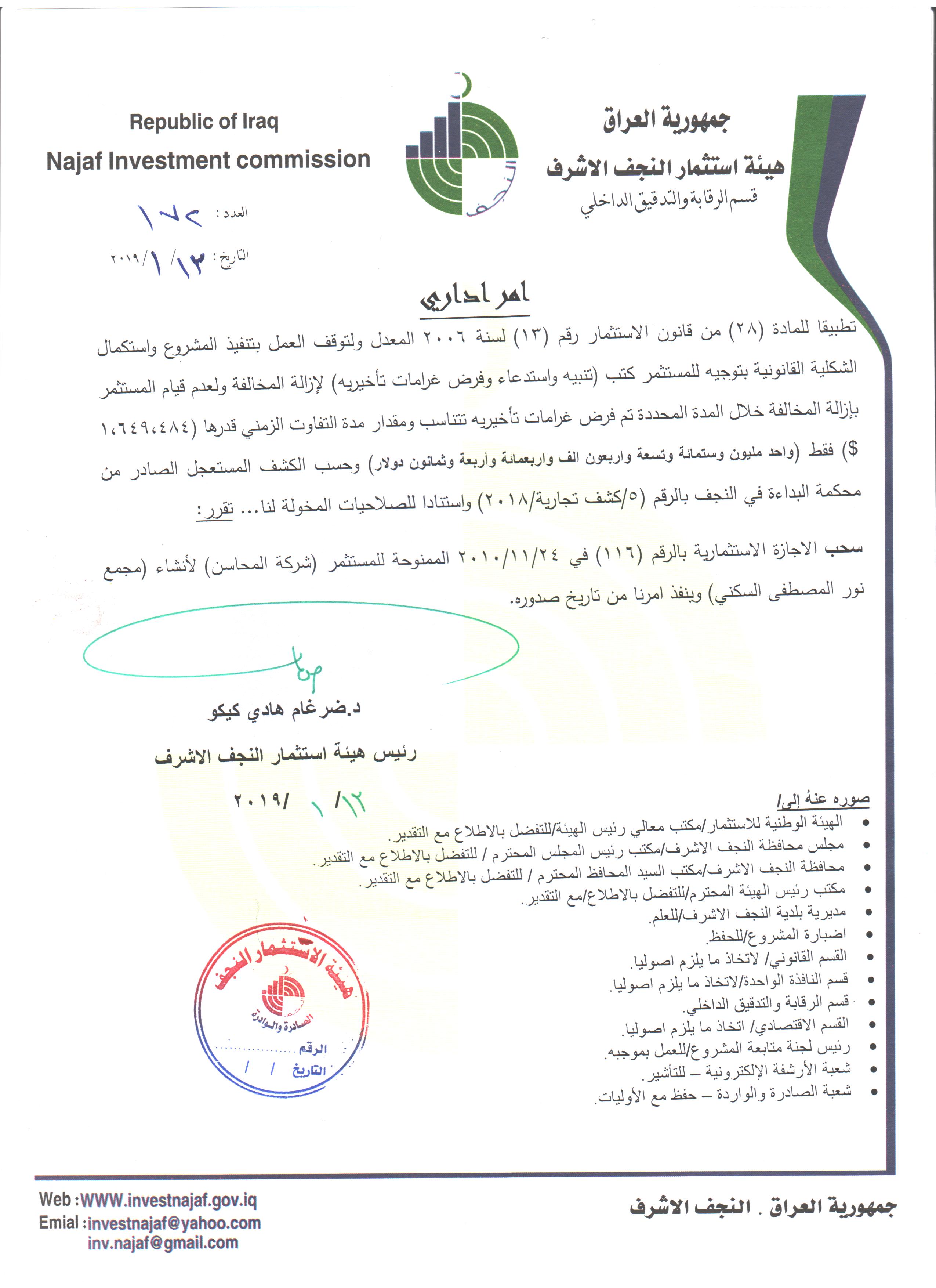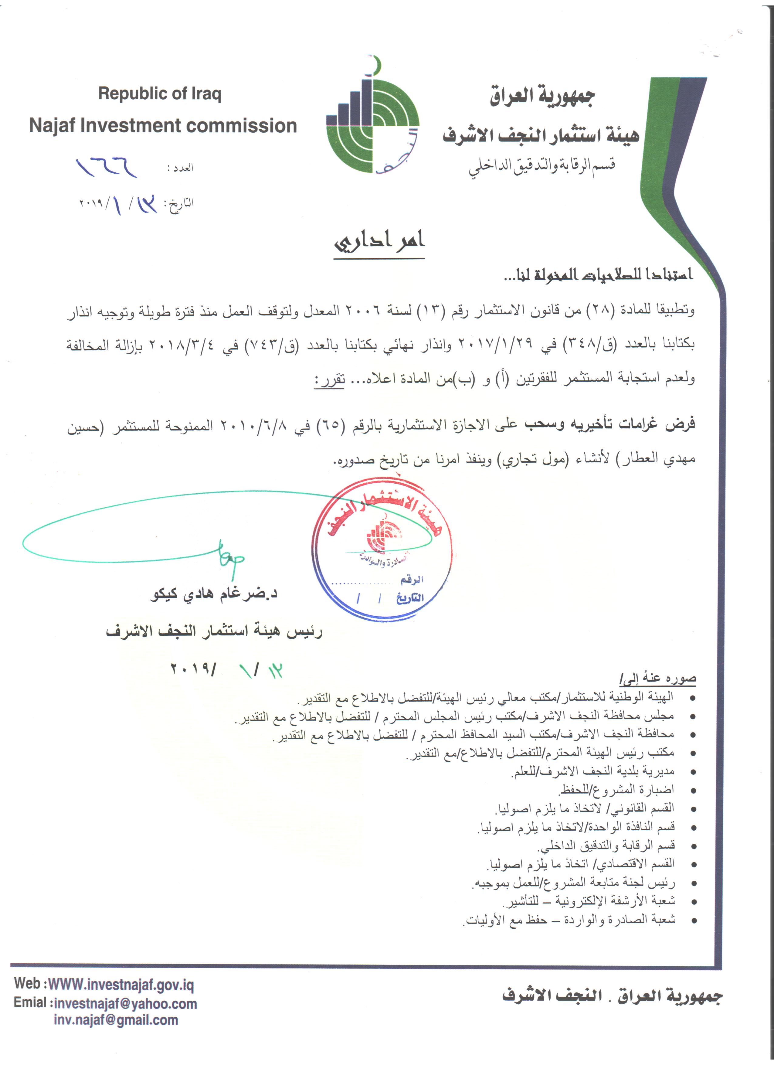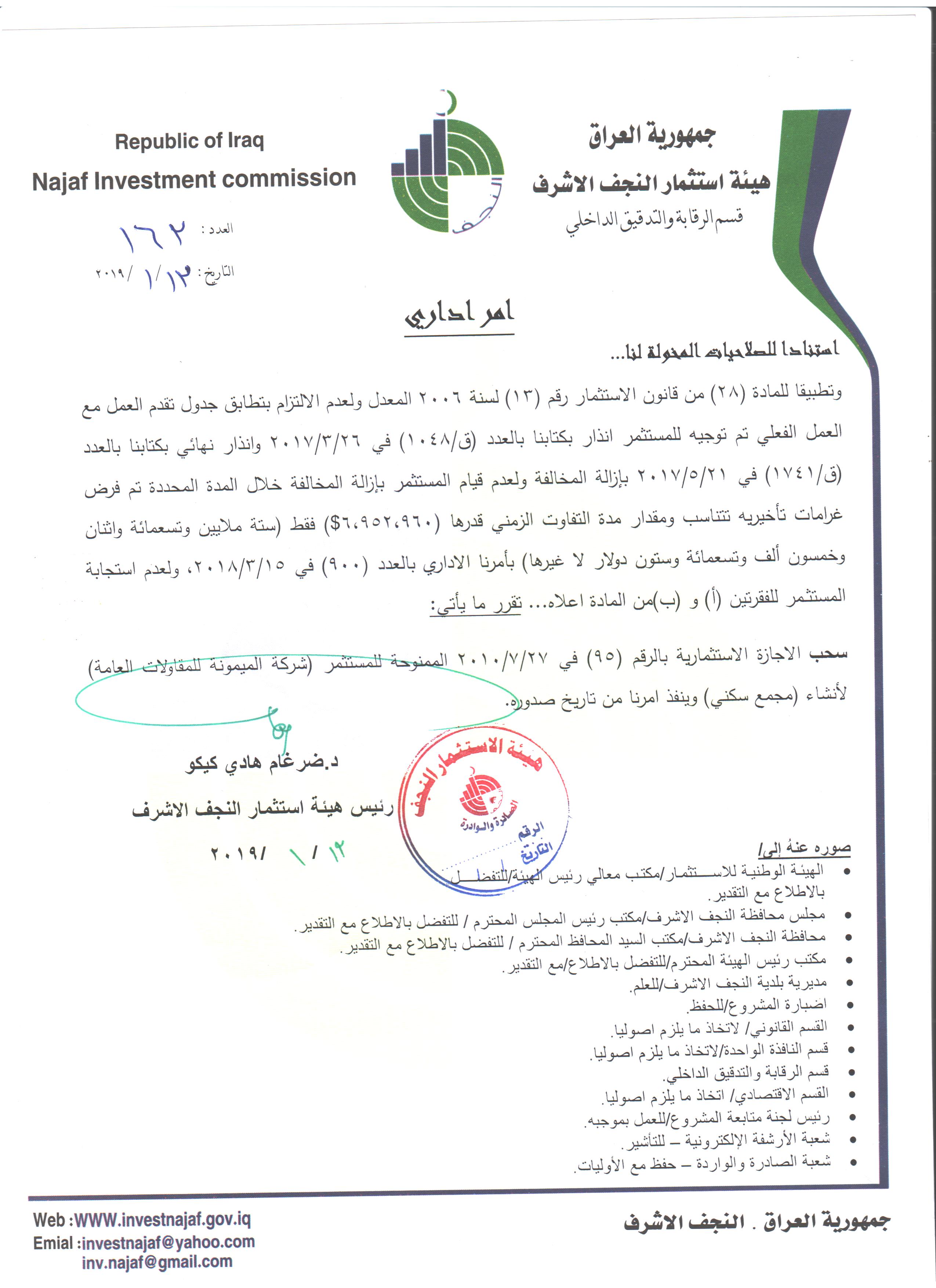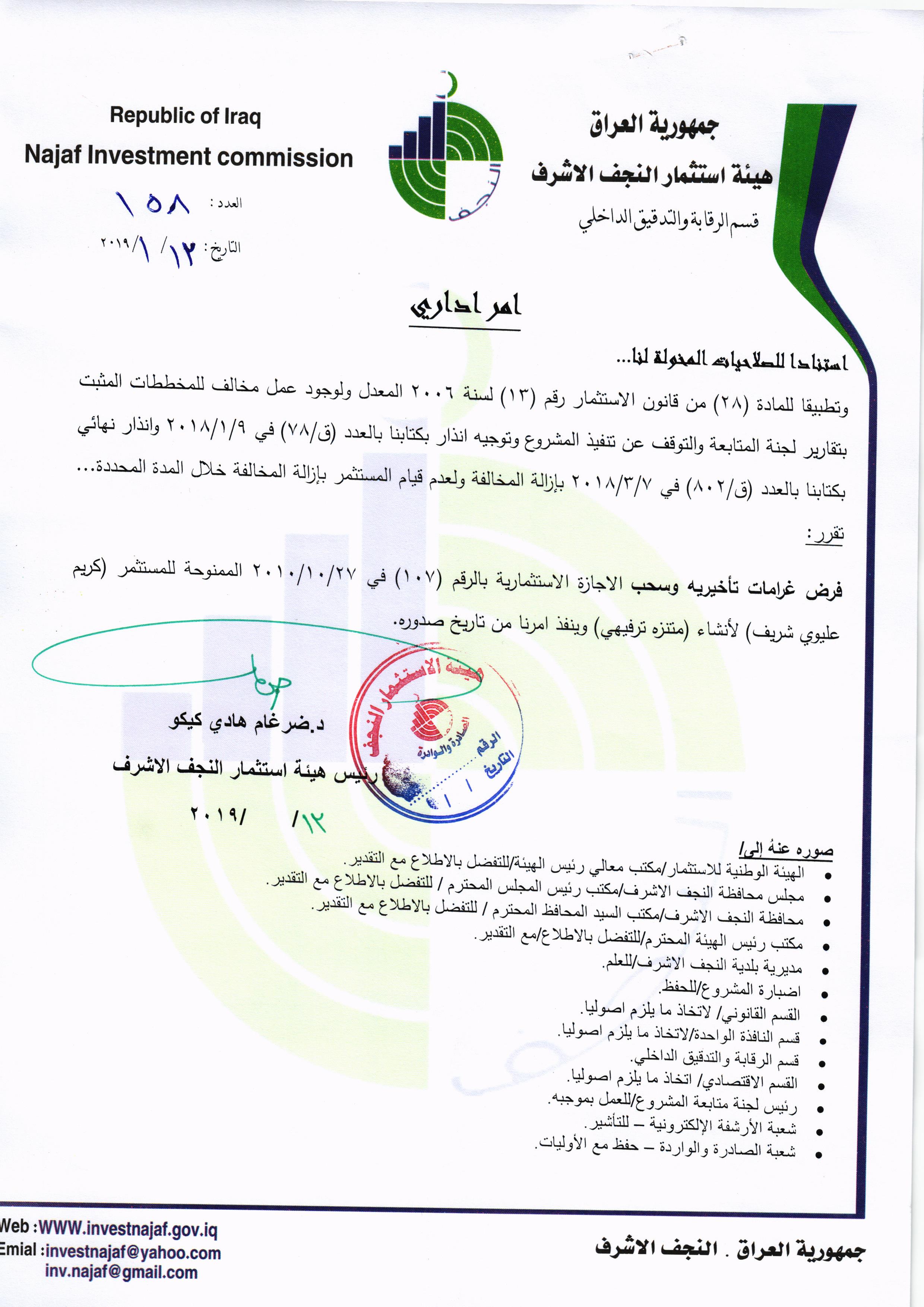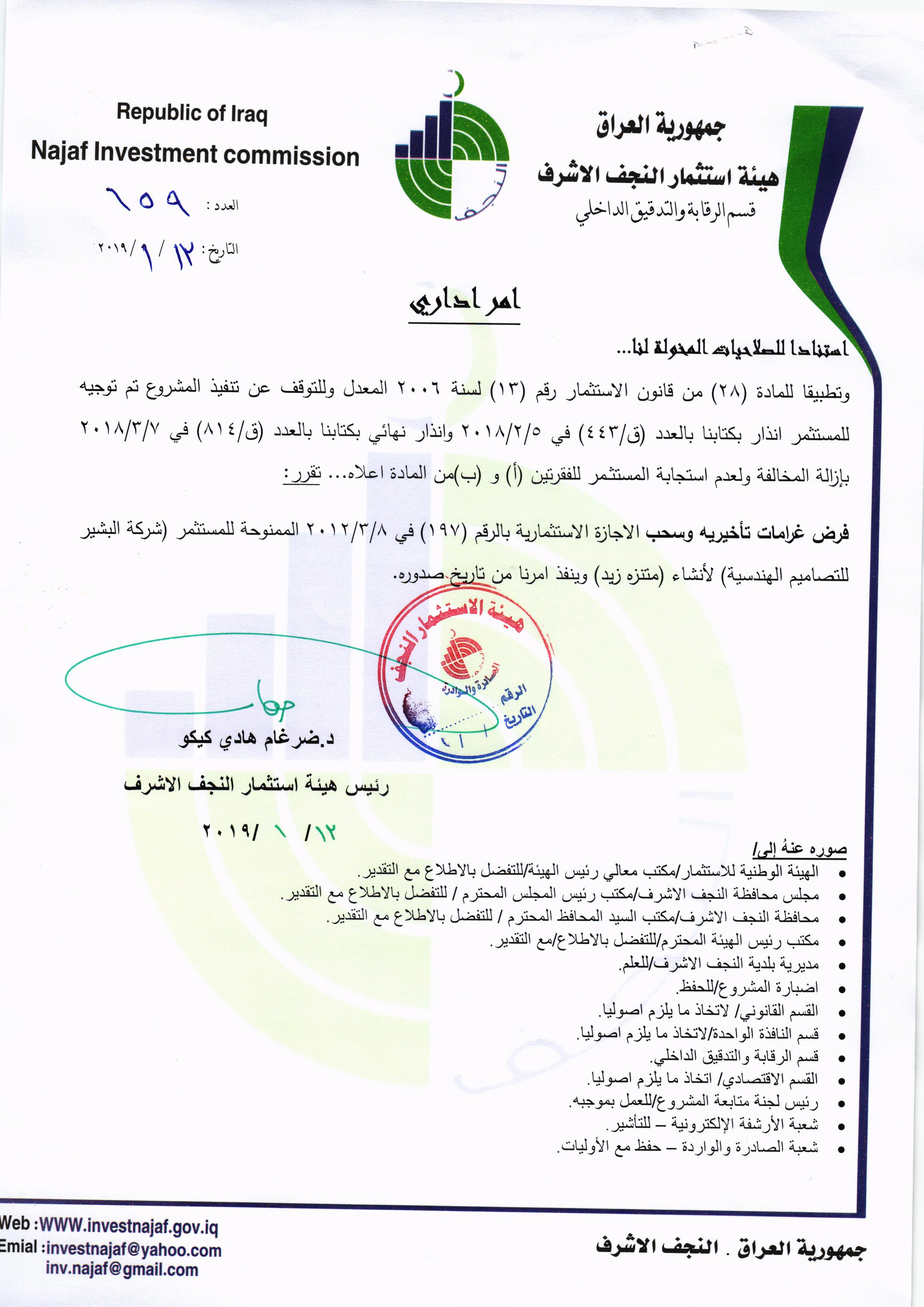 سحب وإلغاء وفرض غرامات تأخيرية ل( 59 ) مشروع استثماري وفق احكام المادة /٢٨ من قانون الأستثمار رقم ١٣ لسنة ٢٠٠٦ المعدل ولكافة المشاريع المتلكئة عن العمل..
