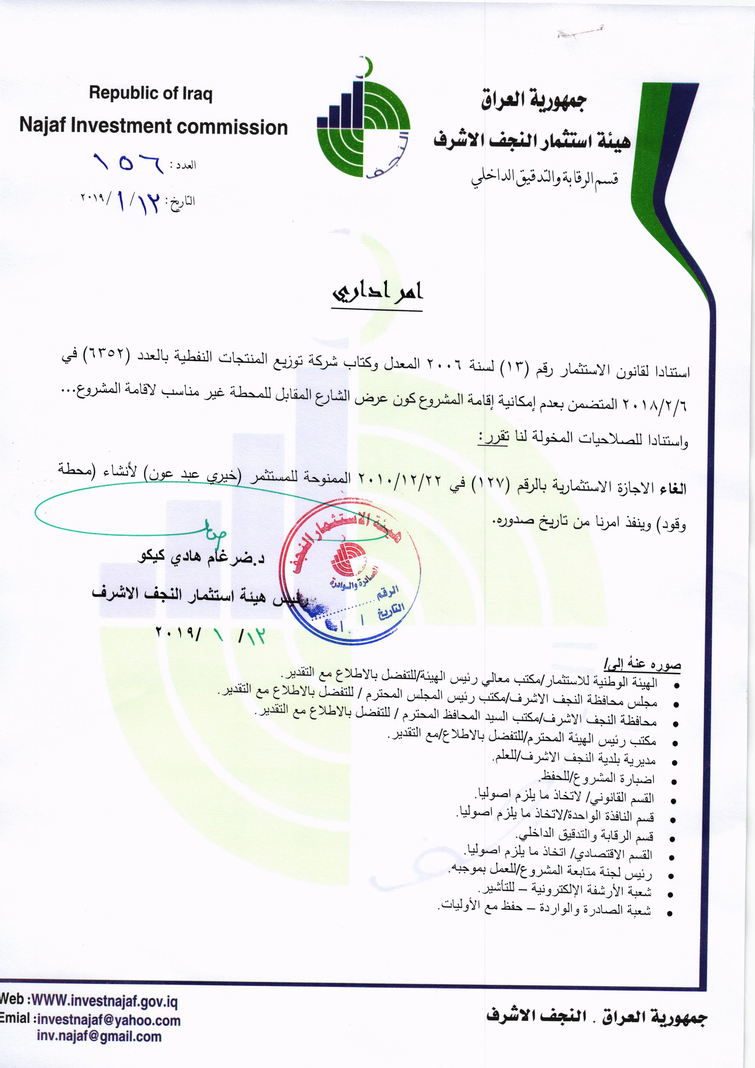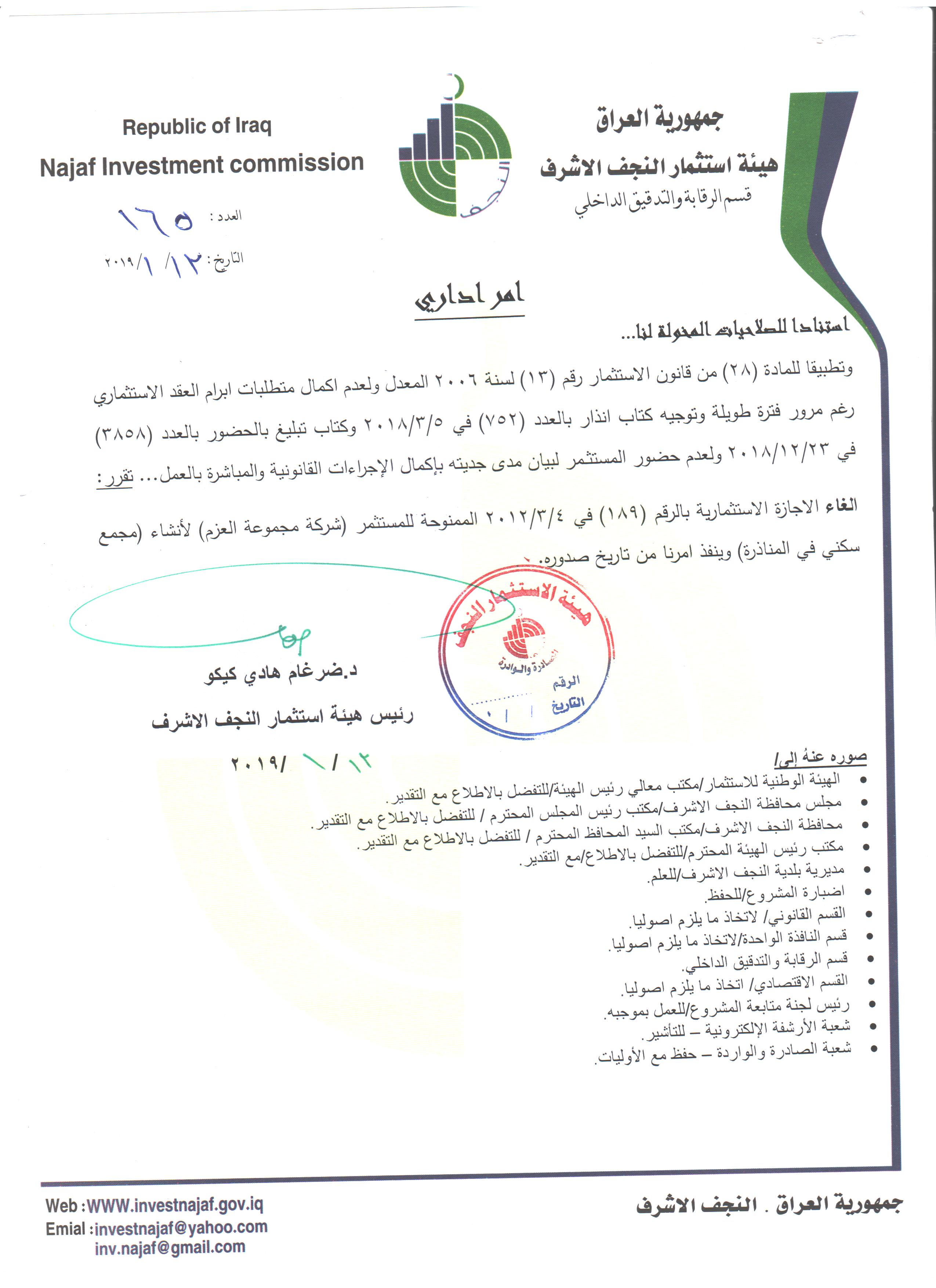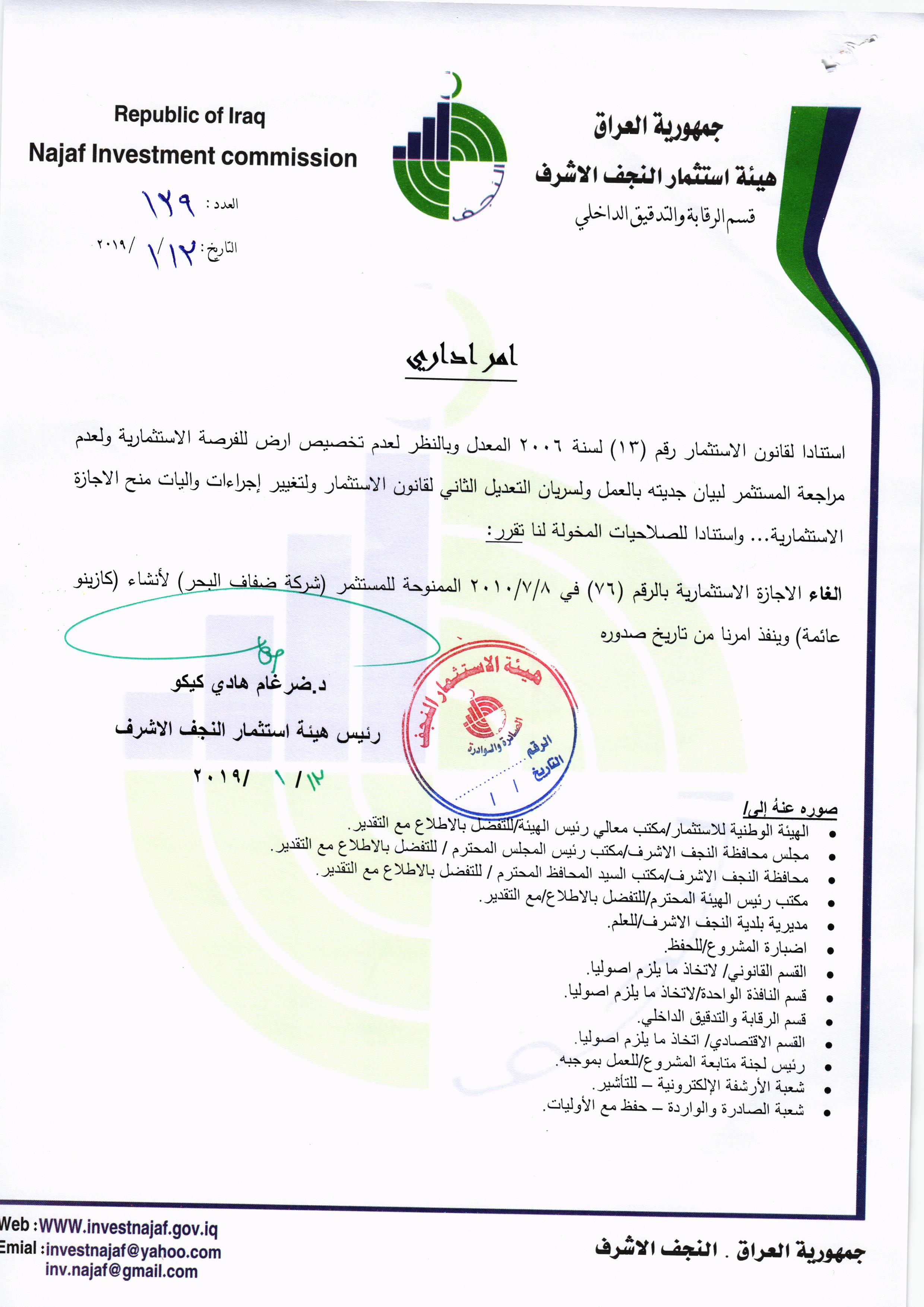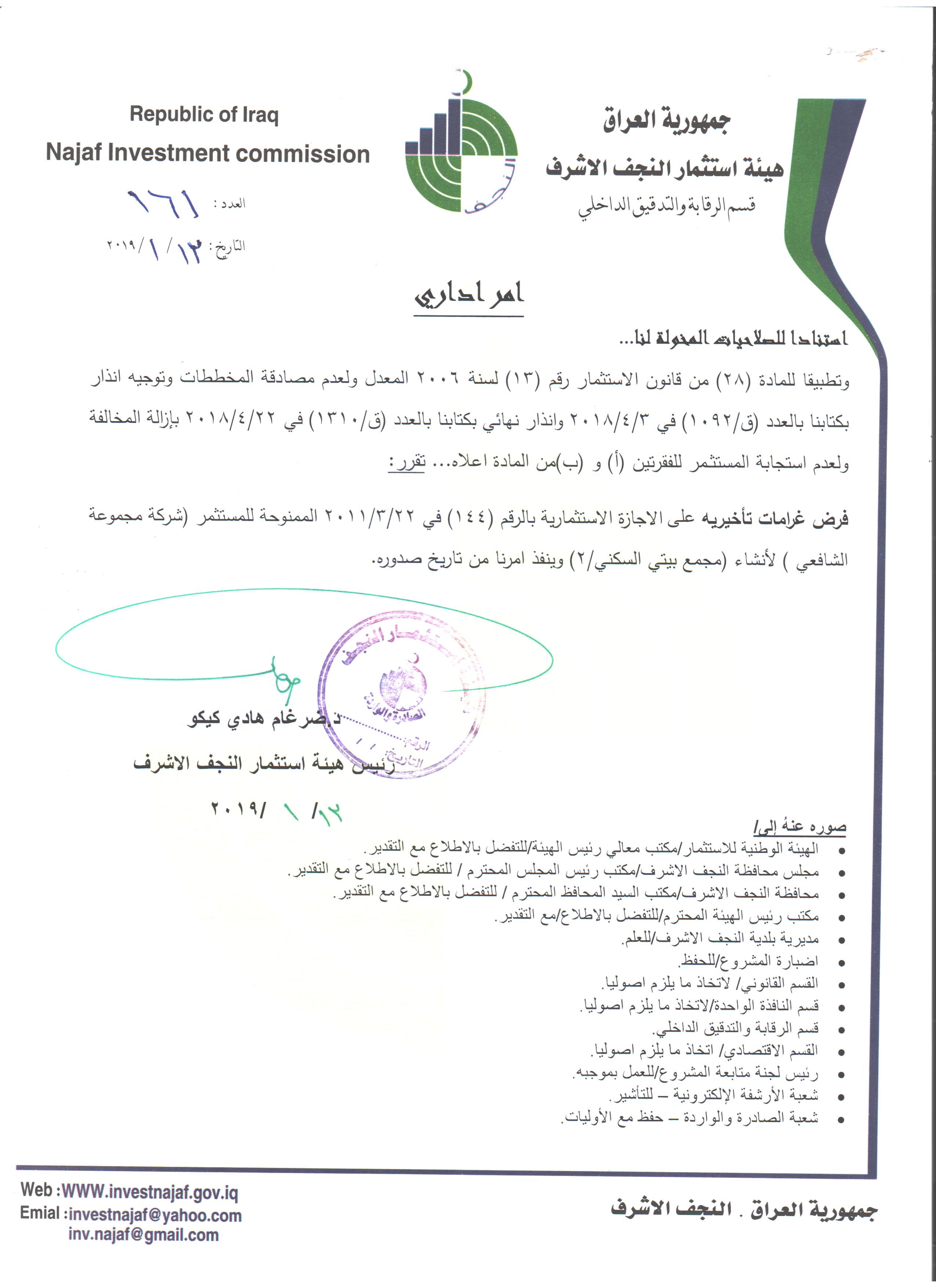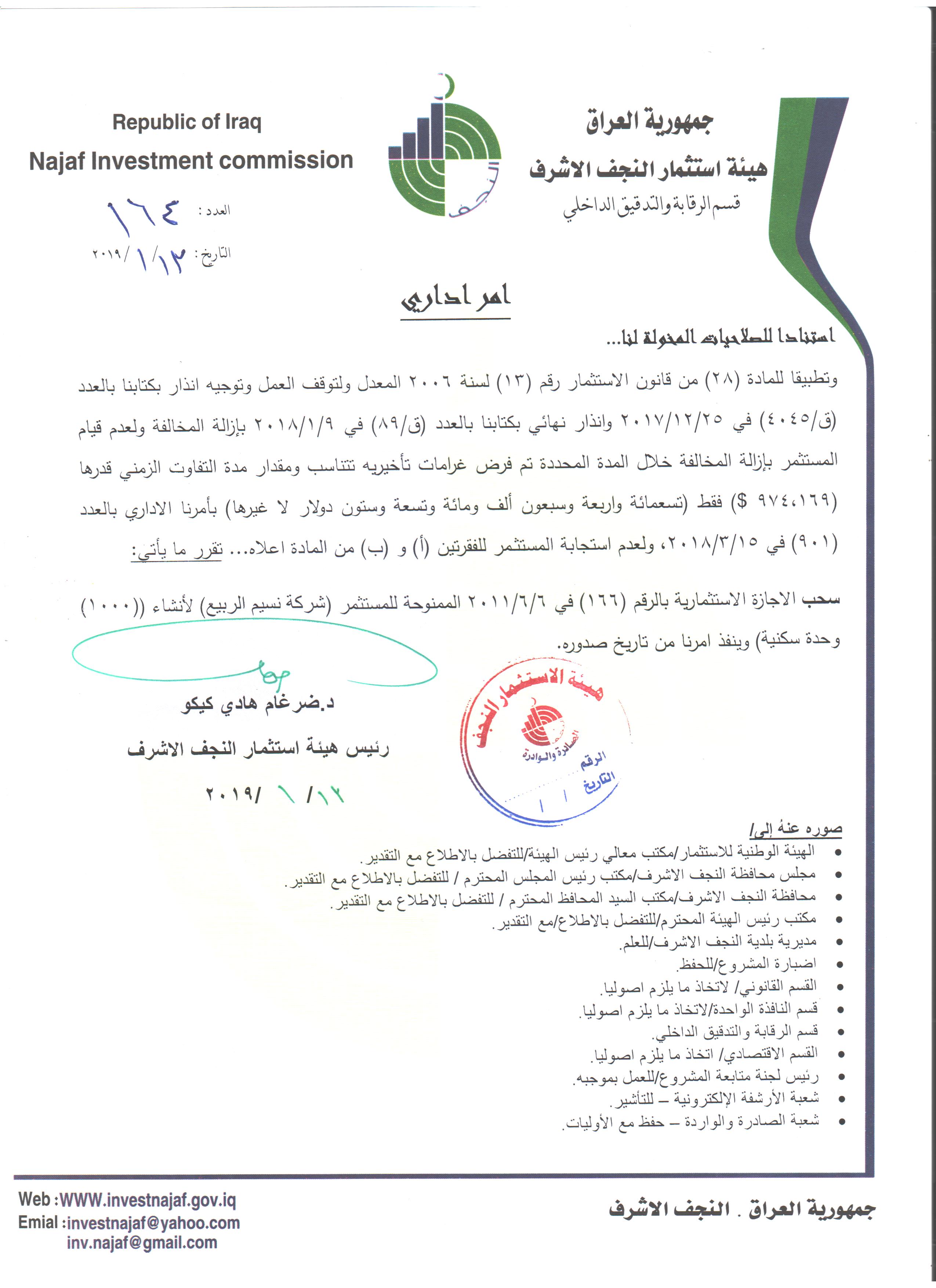 سحب وإلغاء وفرض غرامات تأخيرية ل( 59 ) مشروع استثماري وفق احكام المادة /٢٨ من قانون الأستثمار رقم ١٣ لسنة ٢٠٠٦ المعدل ولكافة المشاريع المتلكئة عن العمل..