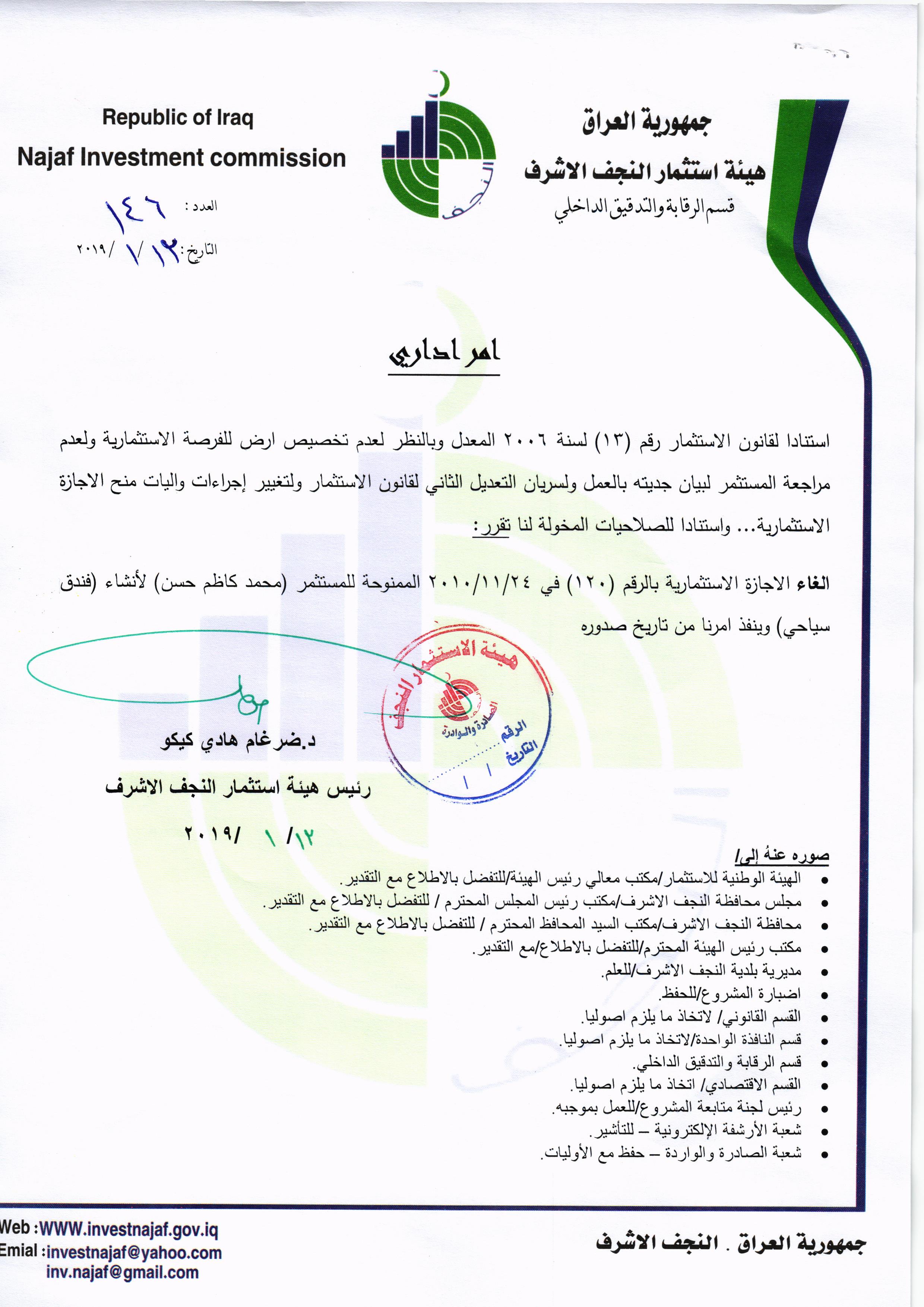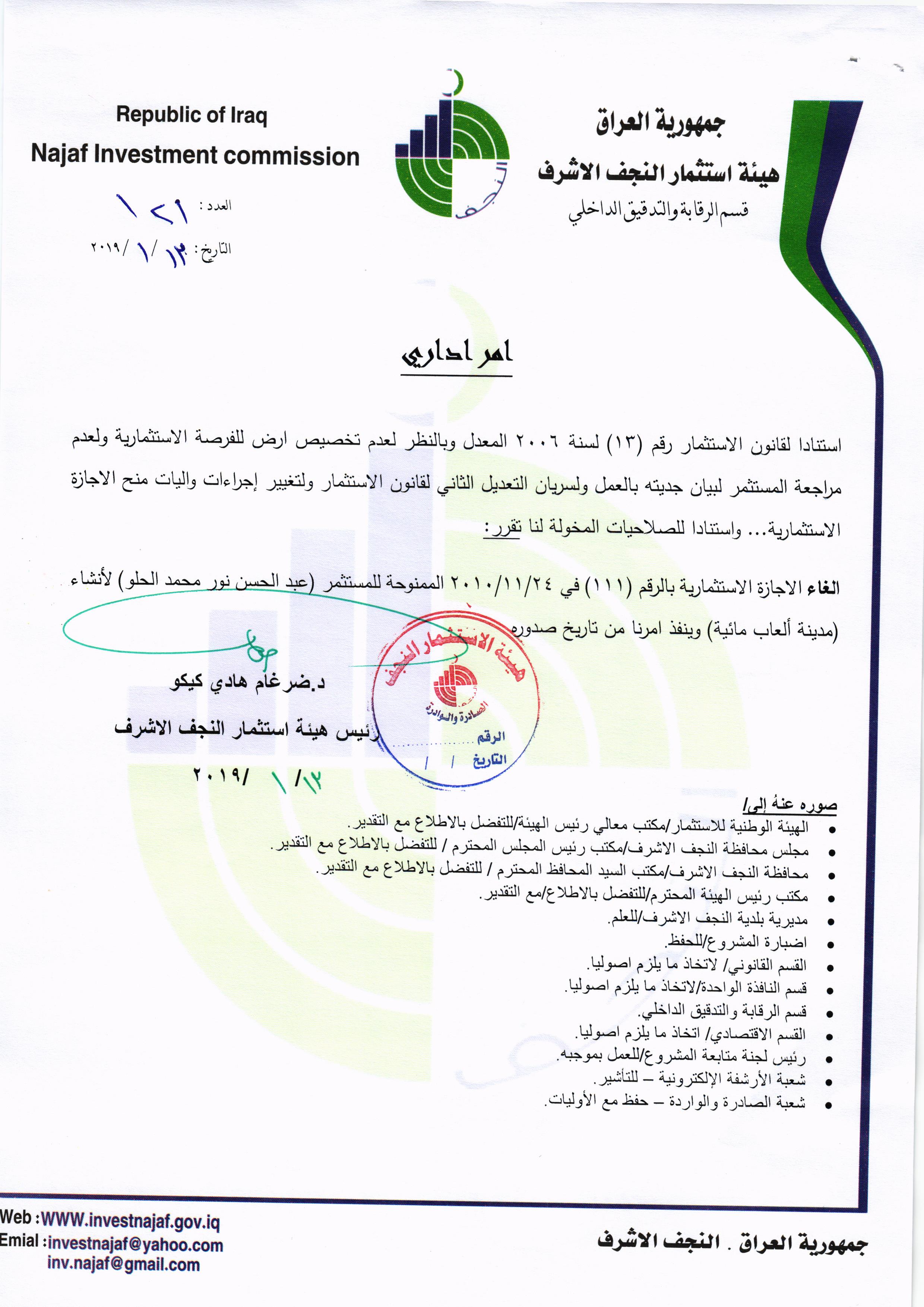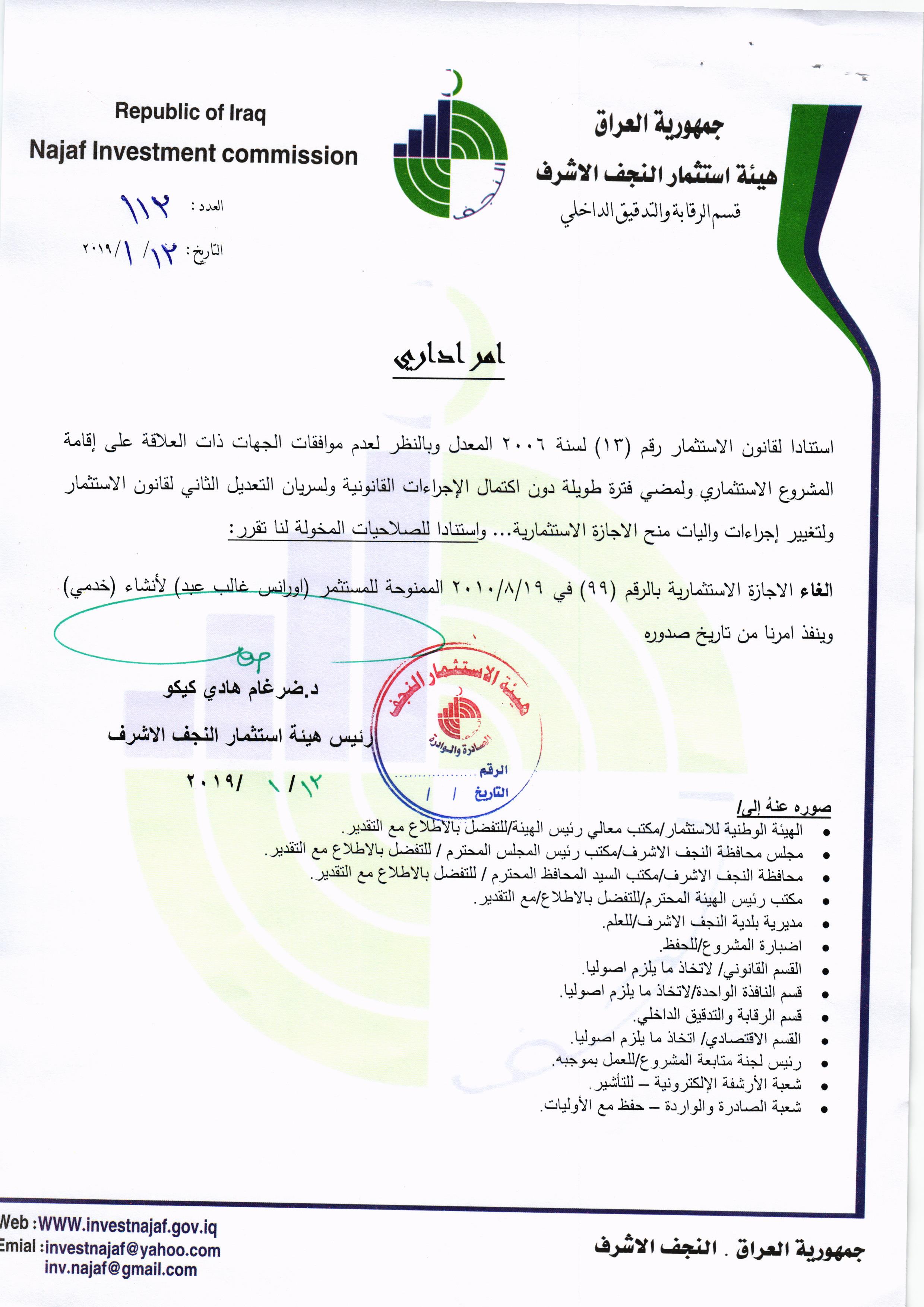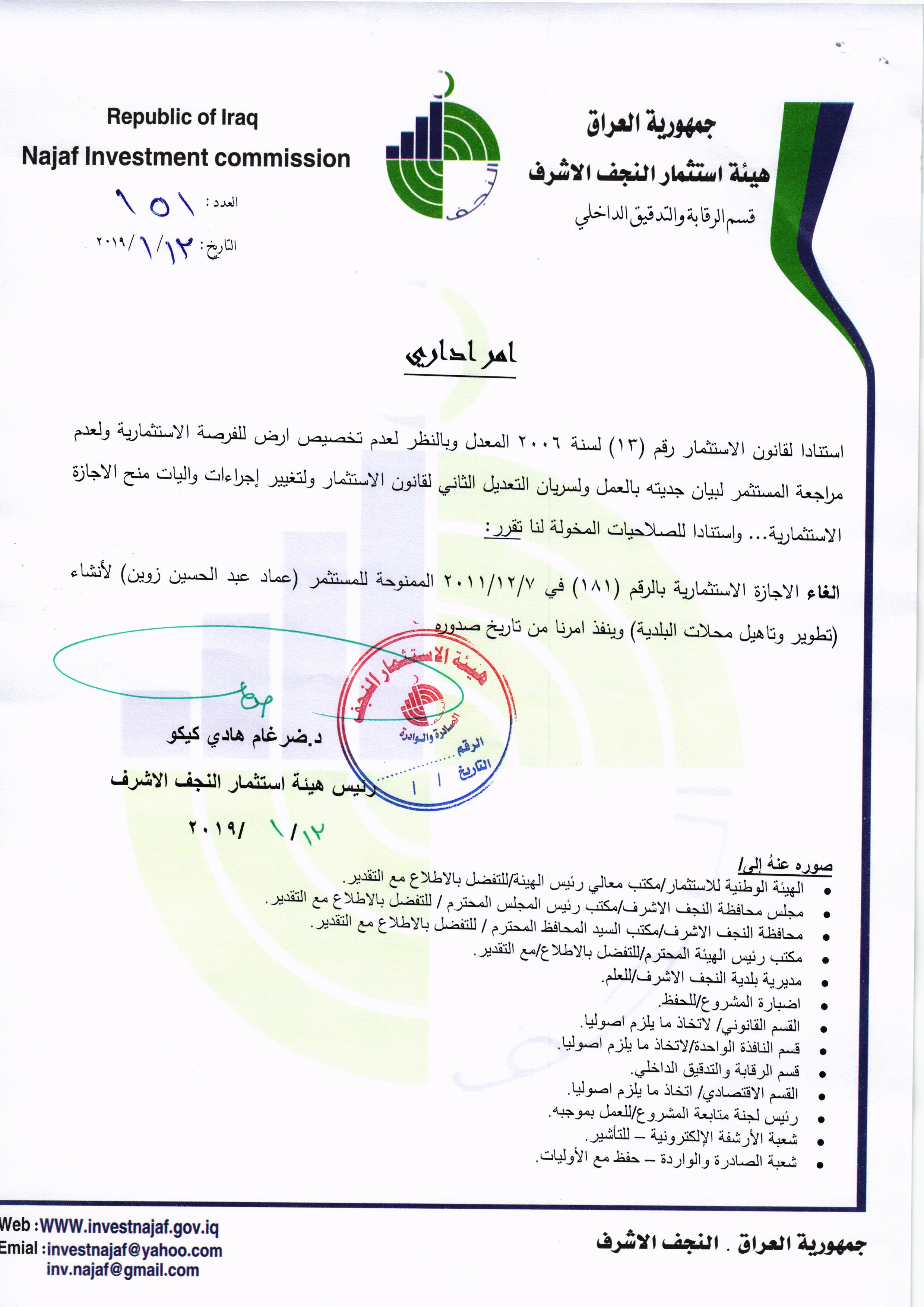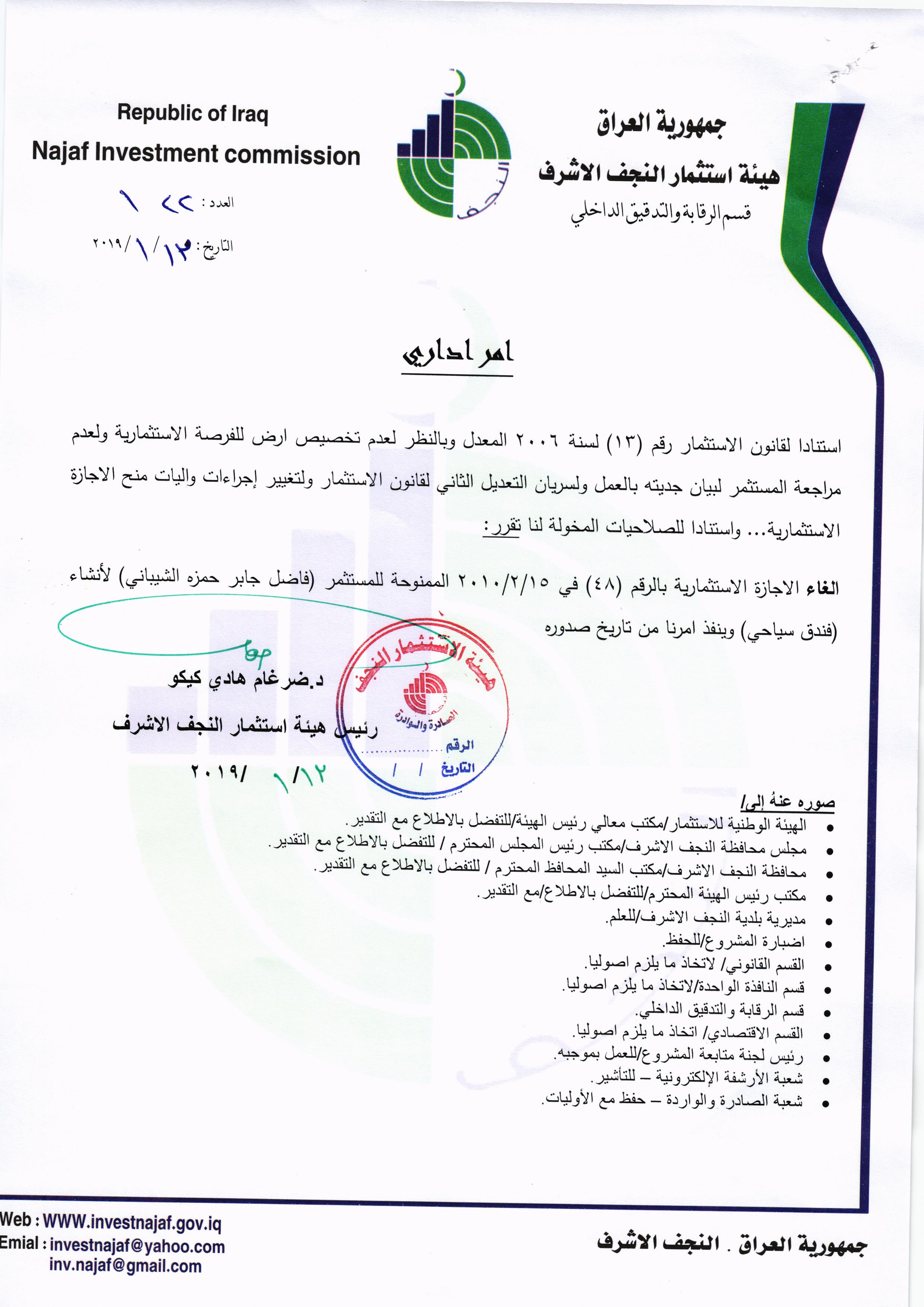 ومن اجل تحقيق العدالة وتطبيق القوانين, لذا تُهيب هيئة استثمار النجف الأشرف بكافة الاخوة من اصحاب الاجازات الاستثمارية التي منحت لهم دون تخصيص الارض لها في عام ٢٠٠٨ ؛ ٢٠٠٩ ؛٢٠١٠ مراجعة مقر الهيئة خلال مدة لاتتجاوز الثلاثة ايام من اجل تبليغهم بما بُتَّ بشأنهم من قرار بسحب تلك الاجازات وحسب القوانين النافذة وما يملك رئيس الهيئة من صلاحيات .