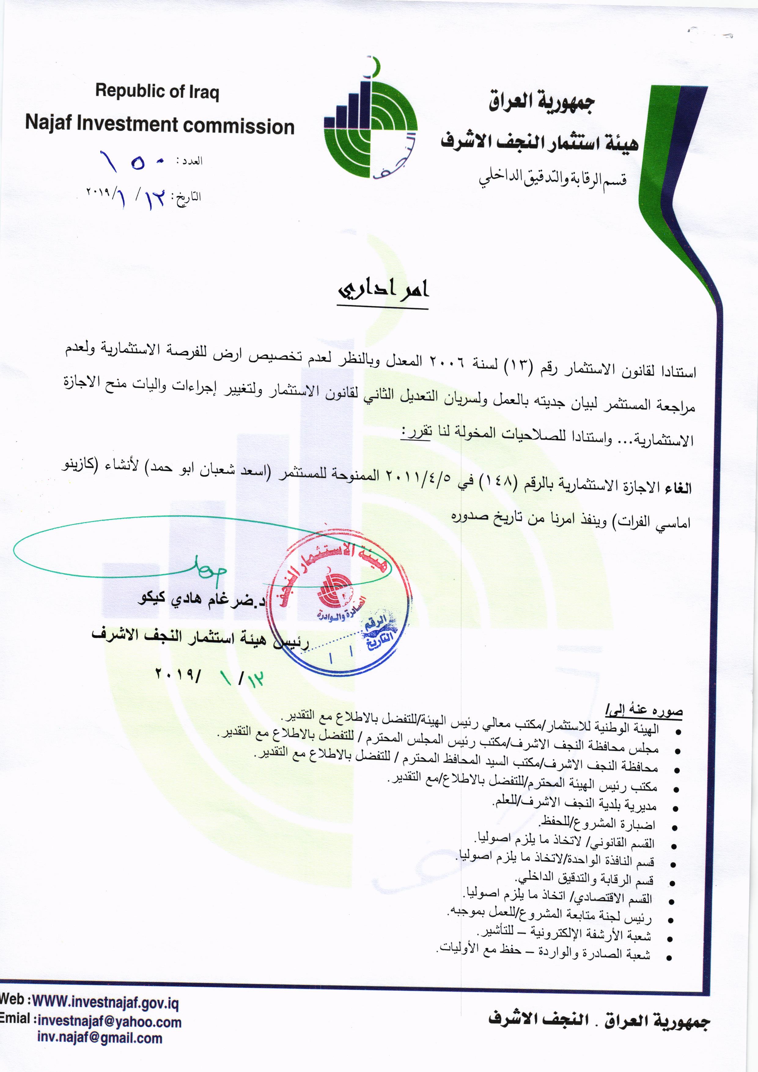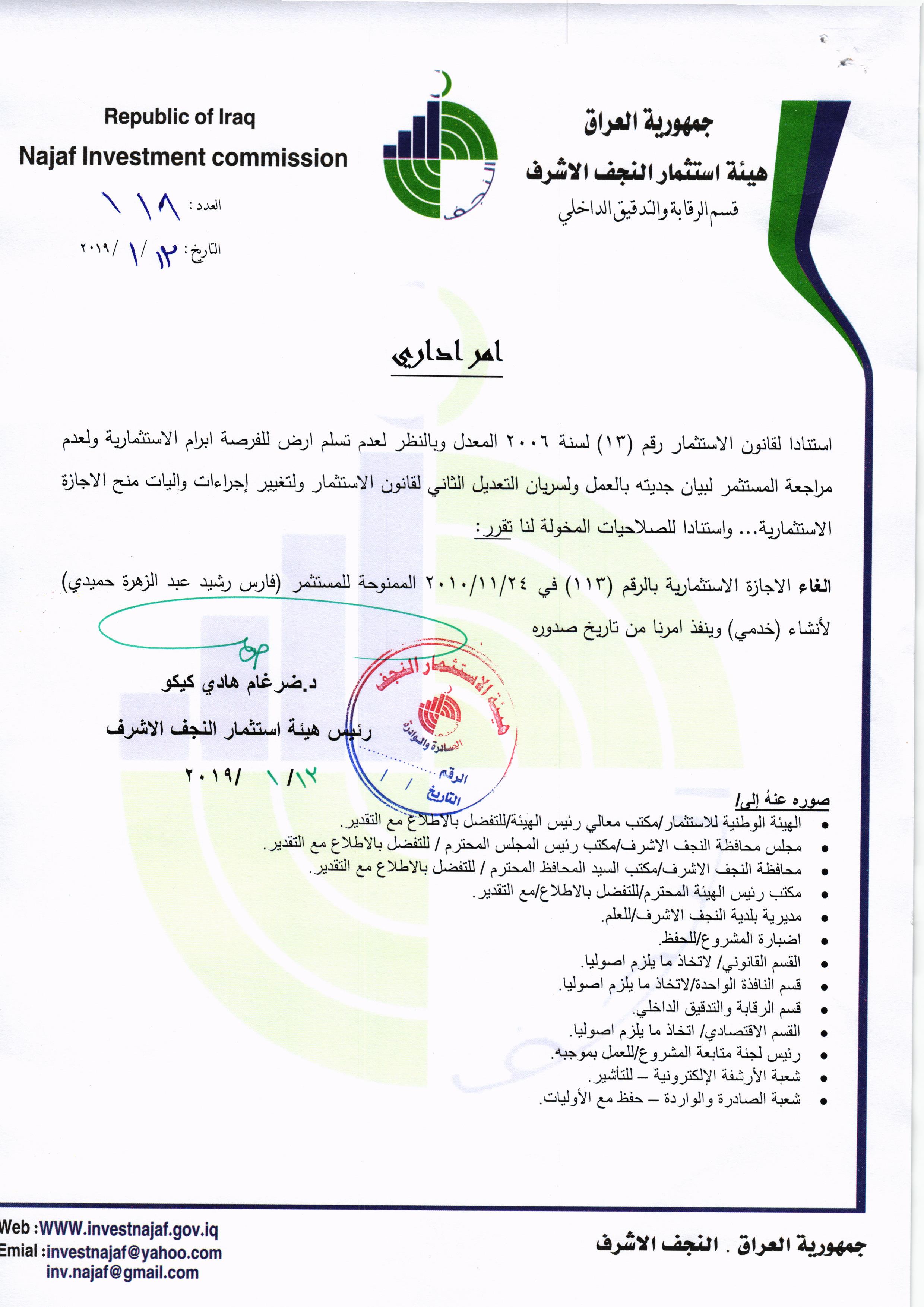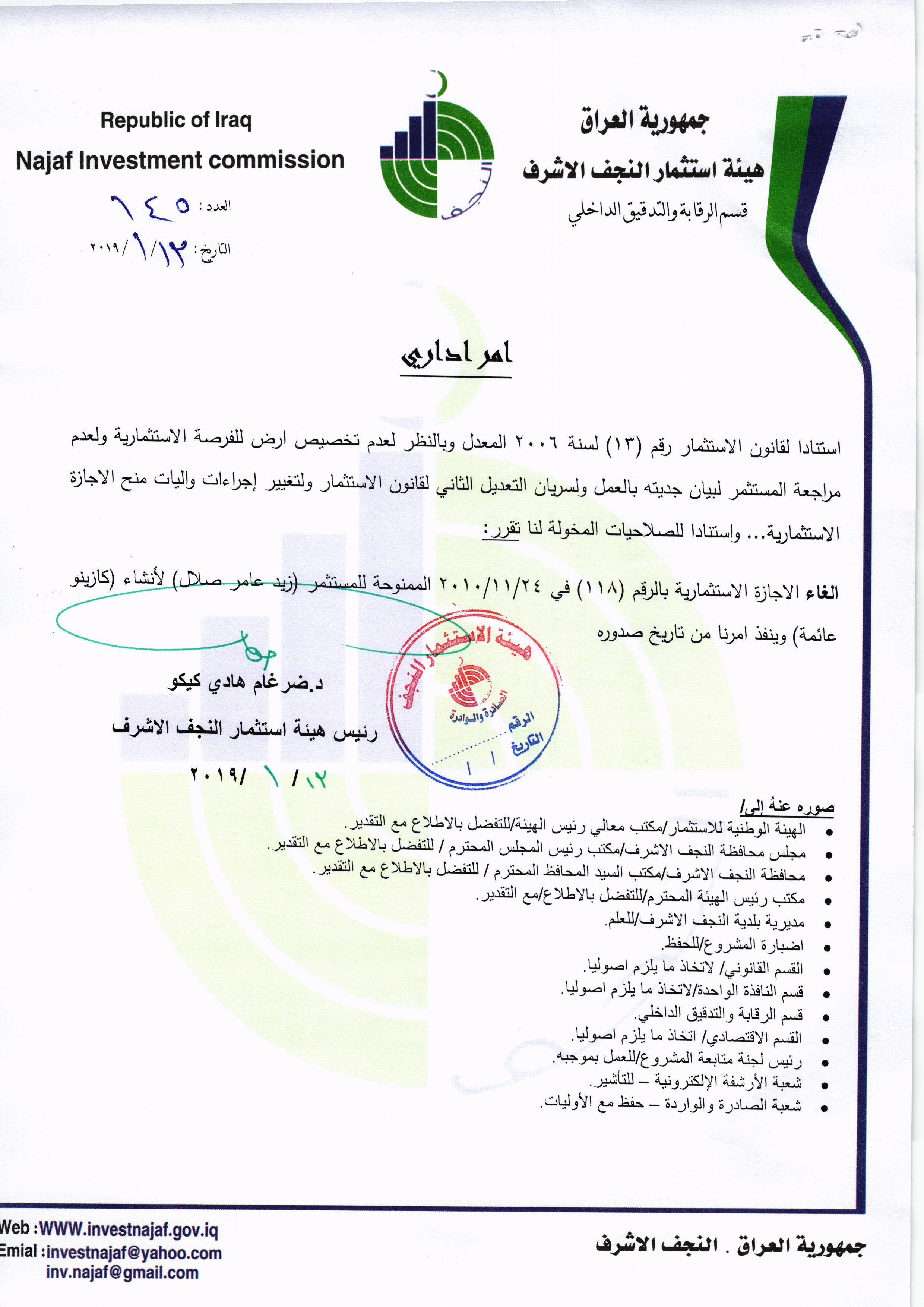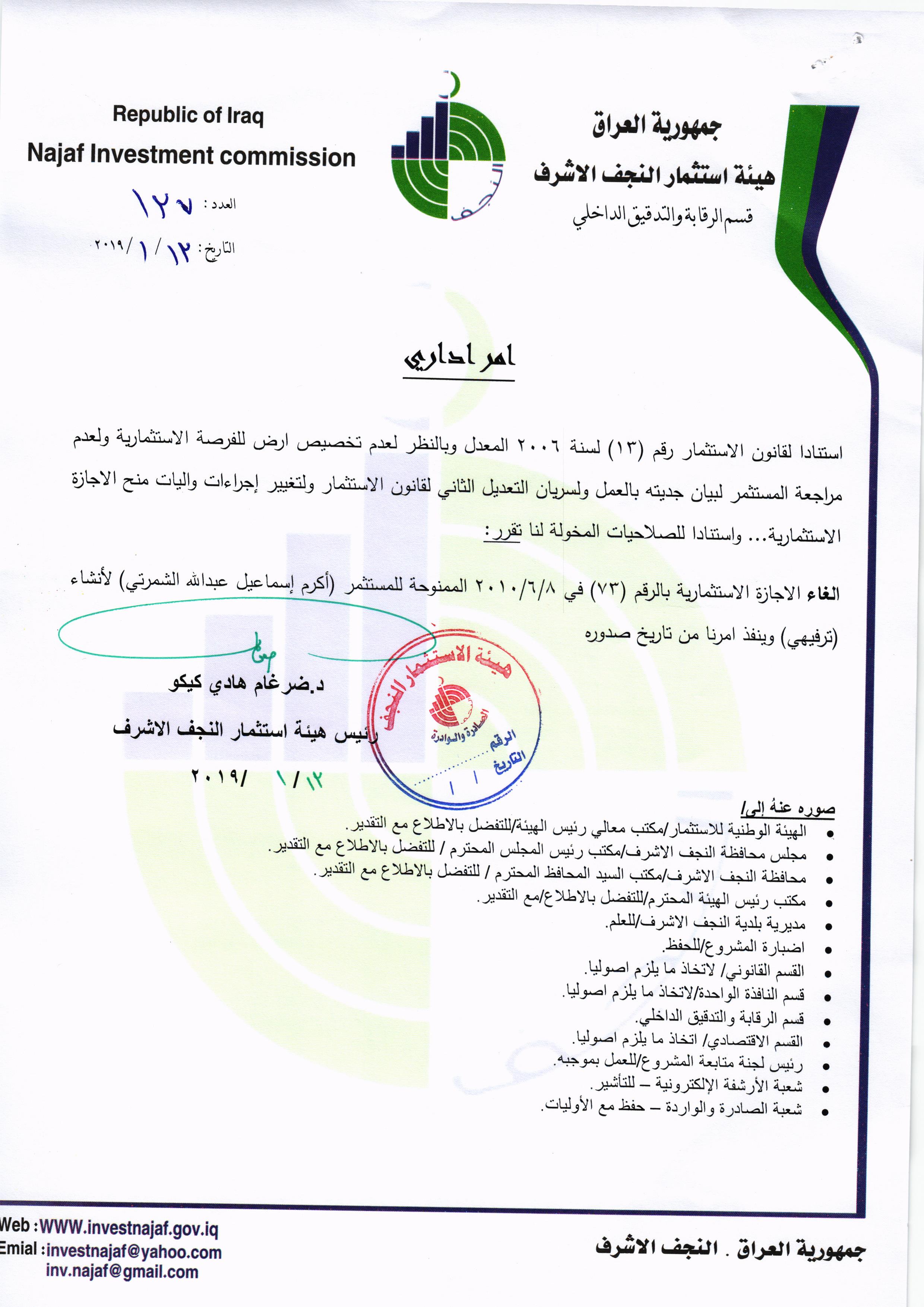 ومن اجل تحقيق العدالة وتطبيق القوانين, لذا تُهيب هيئة استثمار النجف الأشرف بكافة الاخوة من اصحاب الاجازات الاستثمارية التي منحت لهم دون تخصيص الارض لها في عام ٢٠٠٨ ؛ ٢٠٠٩ ؛٢٠١٠ مراجعة مقر الهيئة خلال مدة لاتتجاوز الثلاثة ايام من اجل تبليغهم بما بُتَّ بشأنهم من قرار بسحب تلك الاجازات وحسب القوانين النافذة وما يملك رئيس الهيئة من صلاحيات .