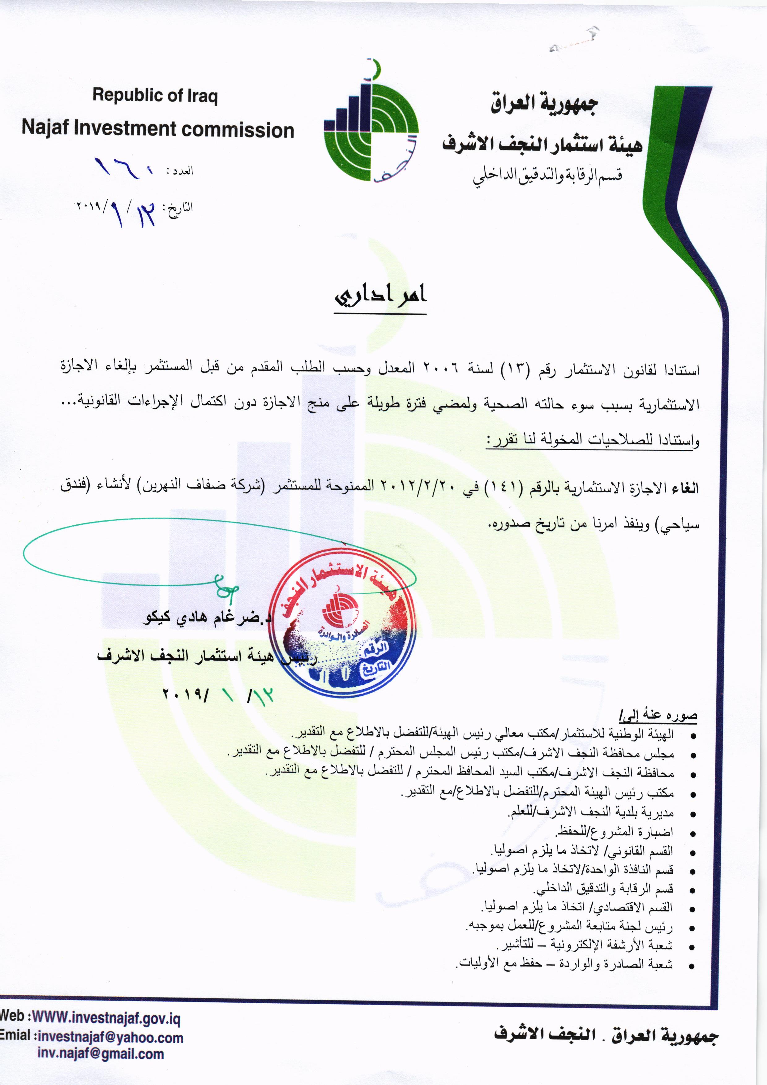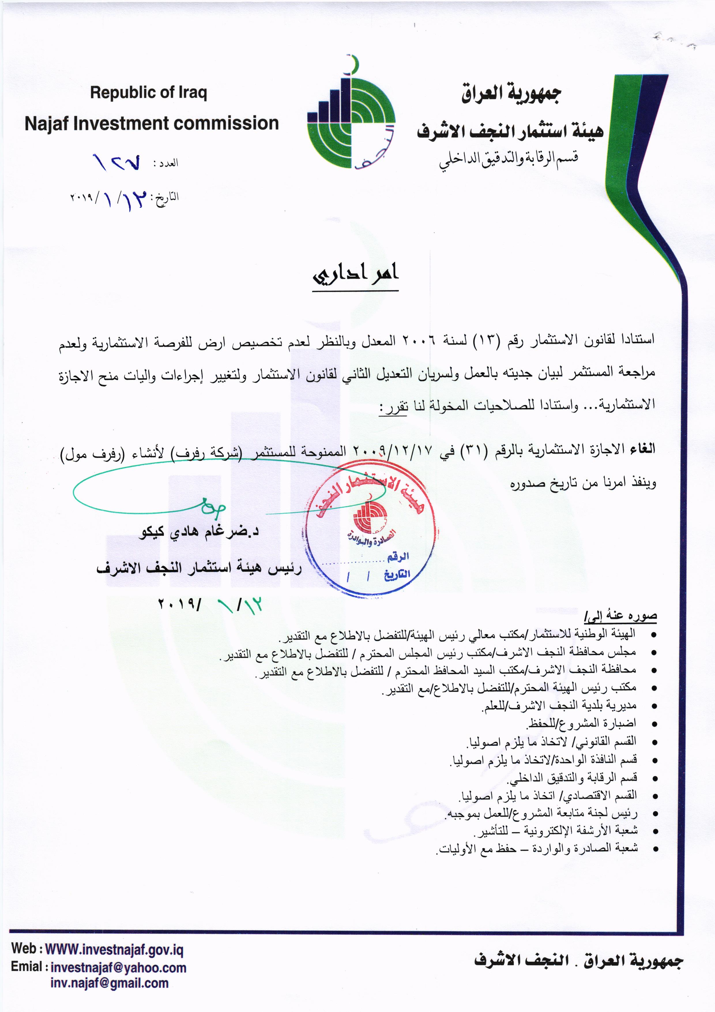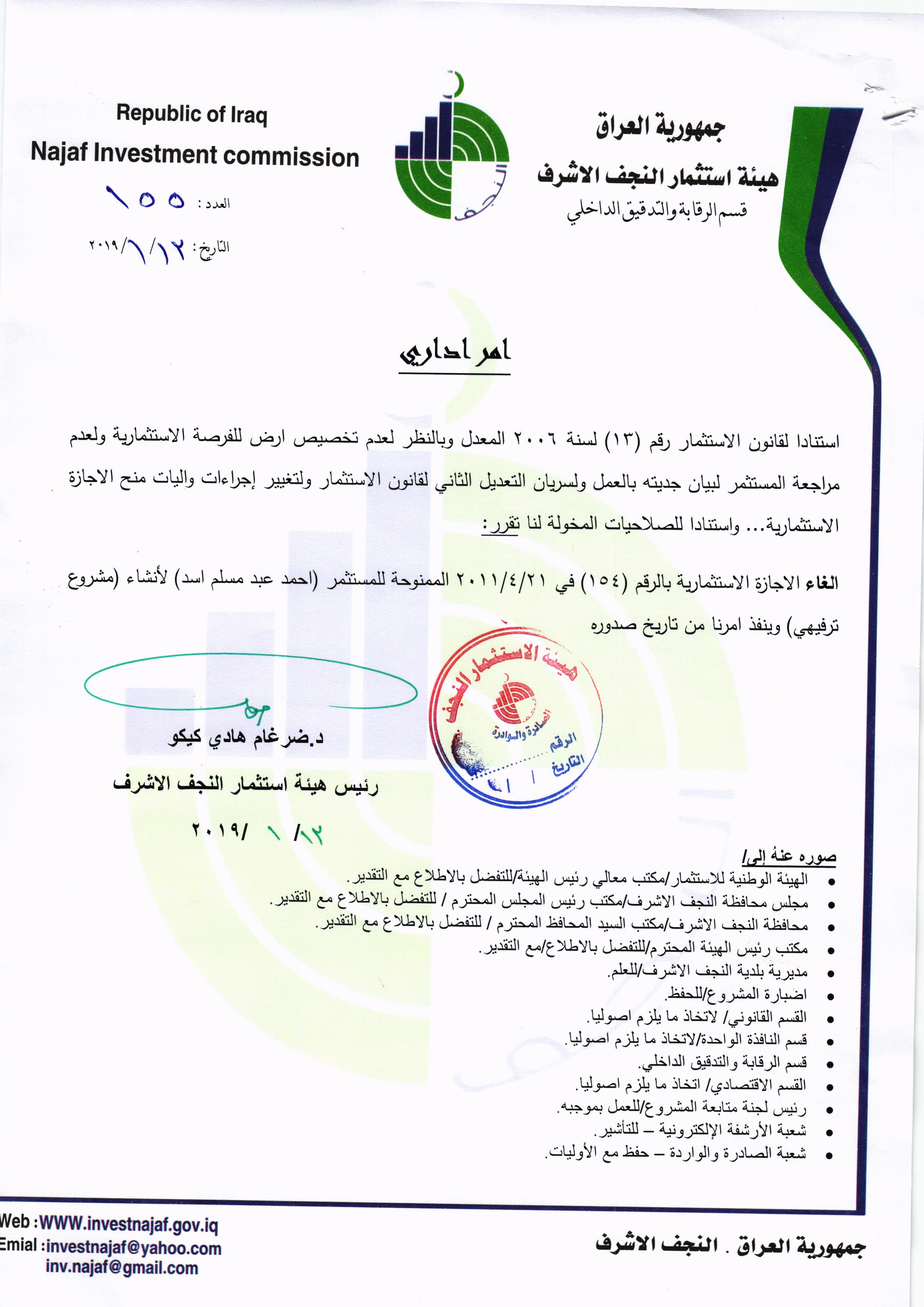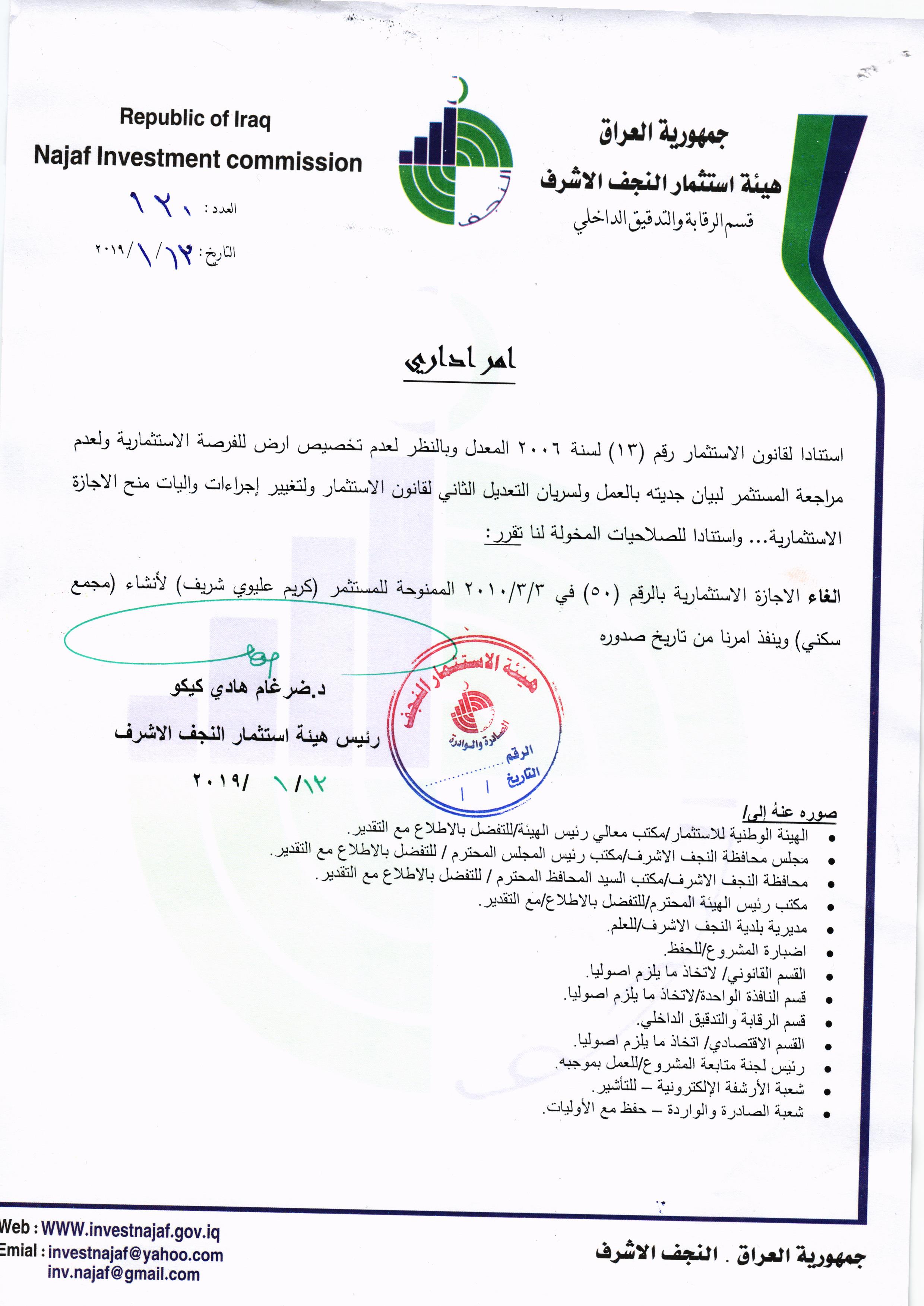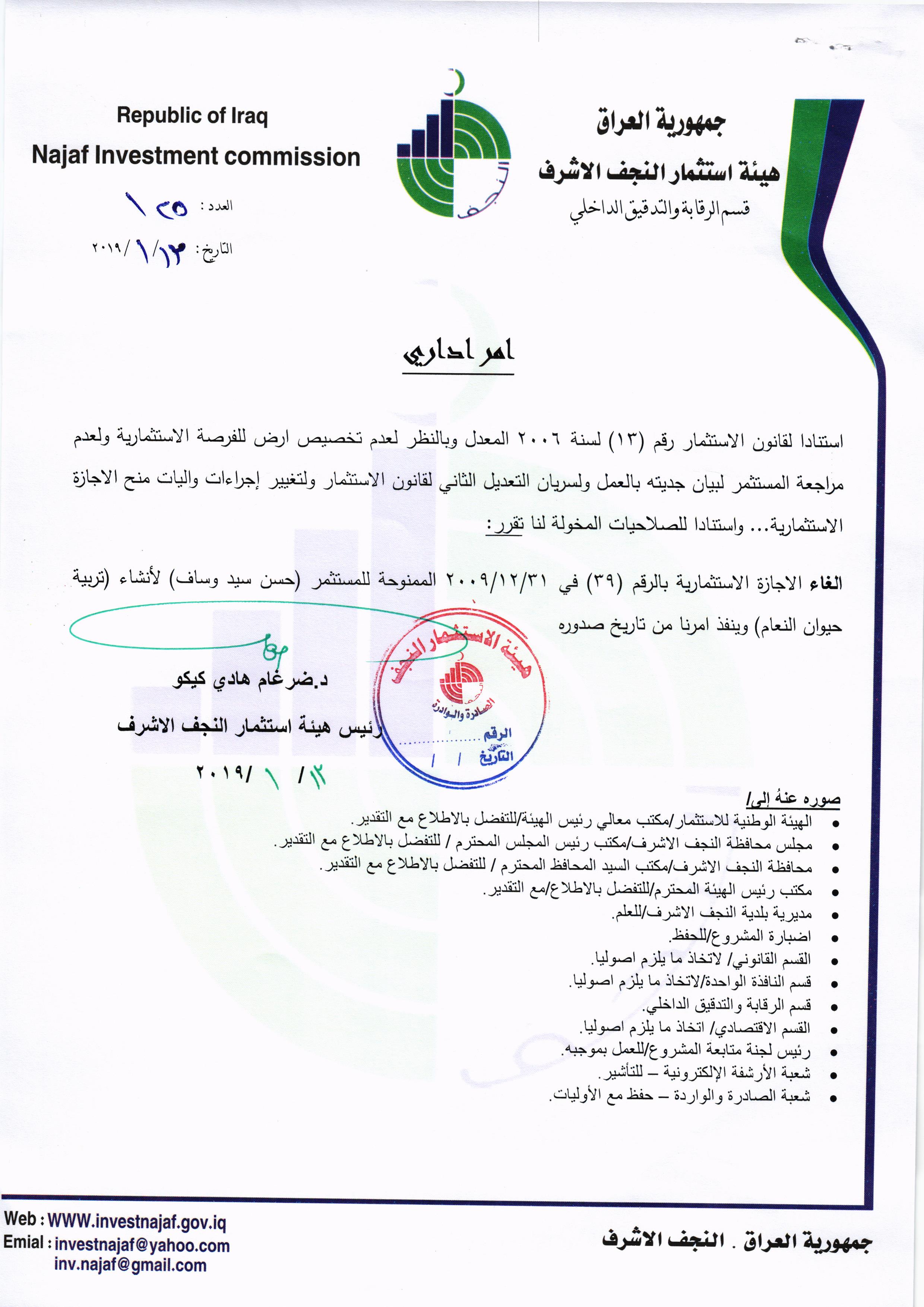 ومن اجل تحقيق العدالة وتطبيق القوانين, لذا تُهيب هيئة استثمار النجف الأشرف بكافة الاخوة من اصحاب الاجازات الاستثمارية التي منحت لهم دون تخصيص الارض لها في عام ٢٠٠٨ ؛ ٢٠٠٩ ؛٢٠١٠ مراجعة مقر الهيئة خلال مدة لاتتجاوز الثلاثة ايام من اجل تبليغهم بما بُتَّ بشأنهم من قرار بسحب تلك الاجازات وحسب القوانين النافذة وما يملك رئيس الهيئة من صلاحيات .