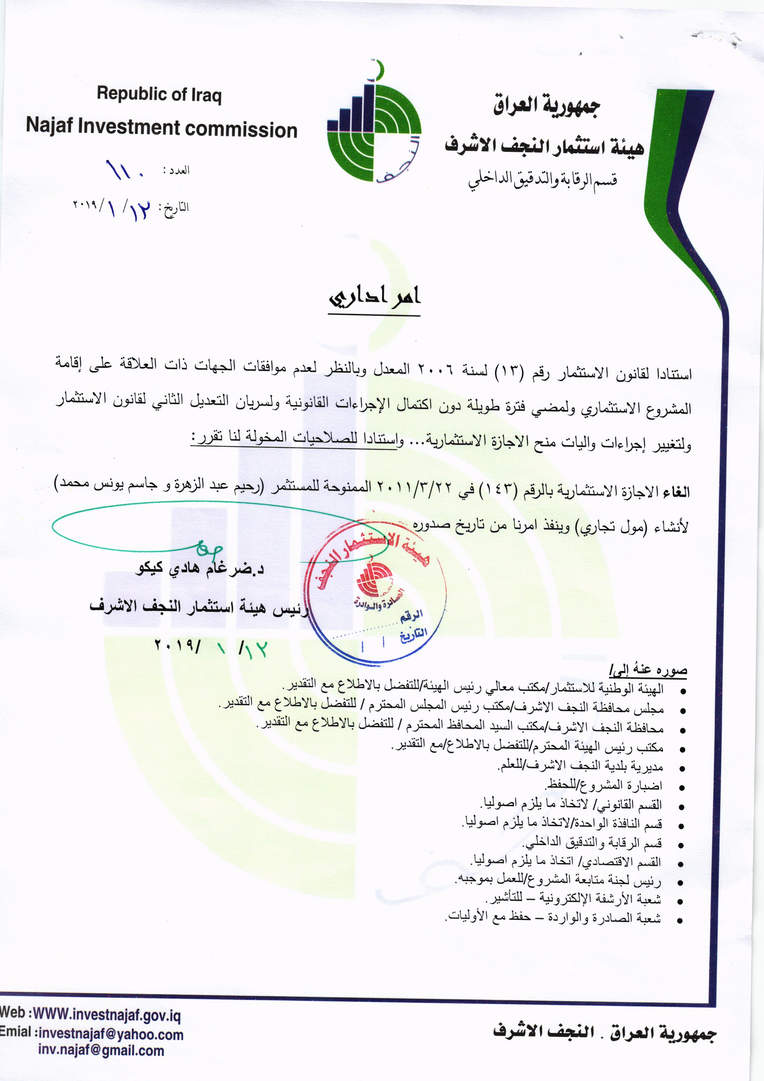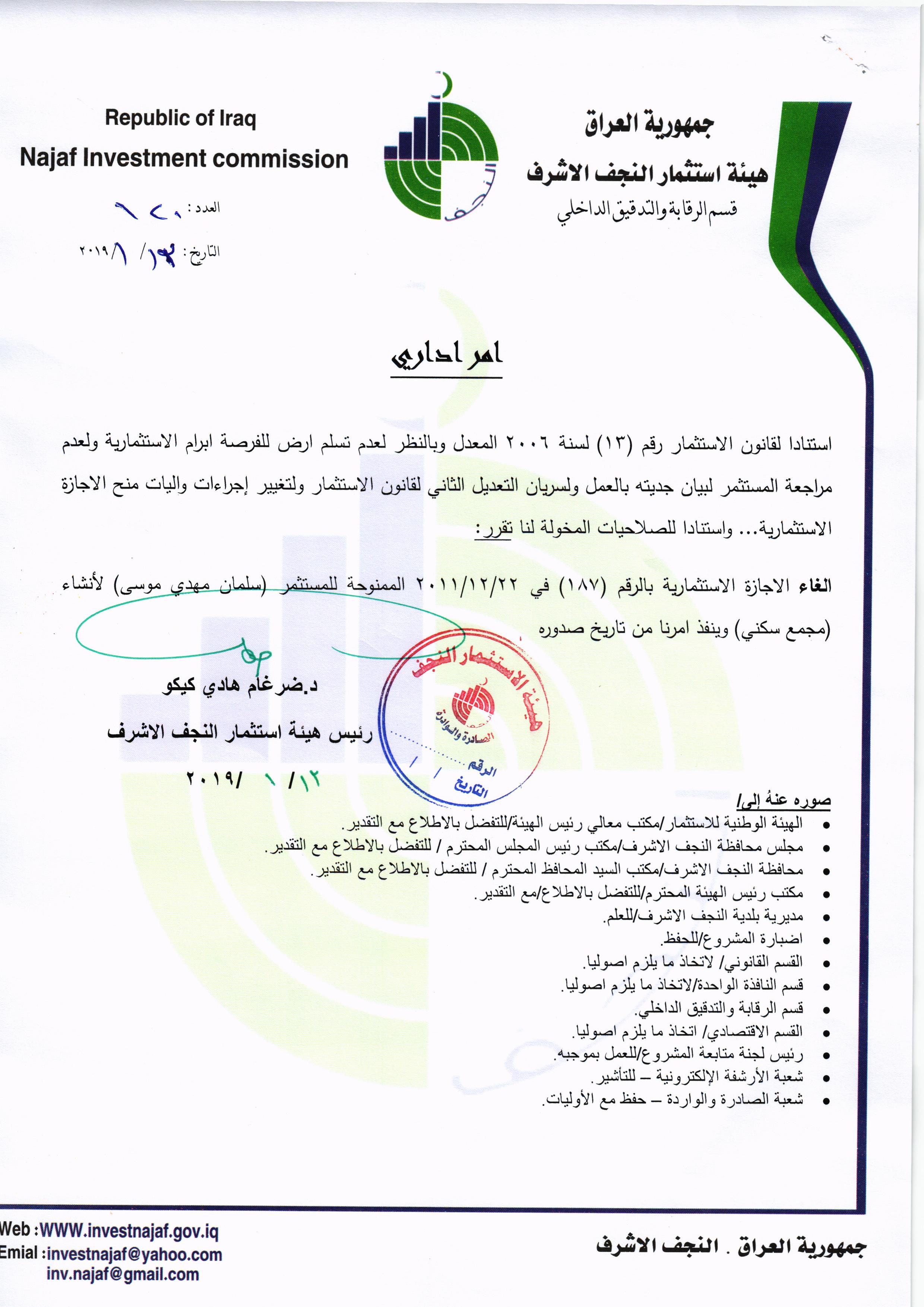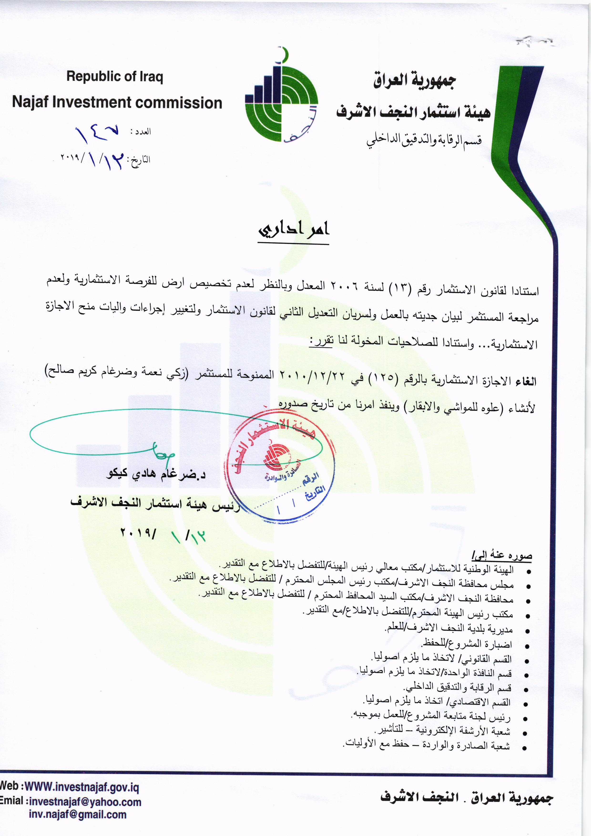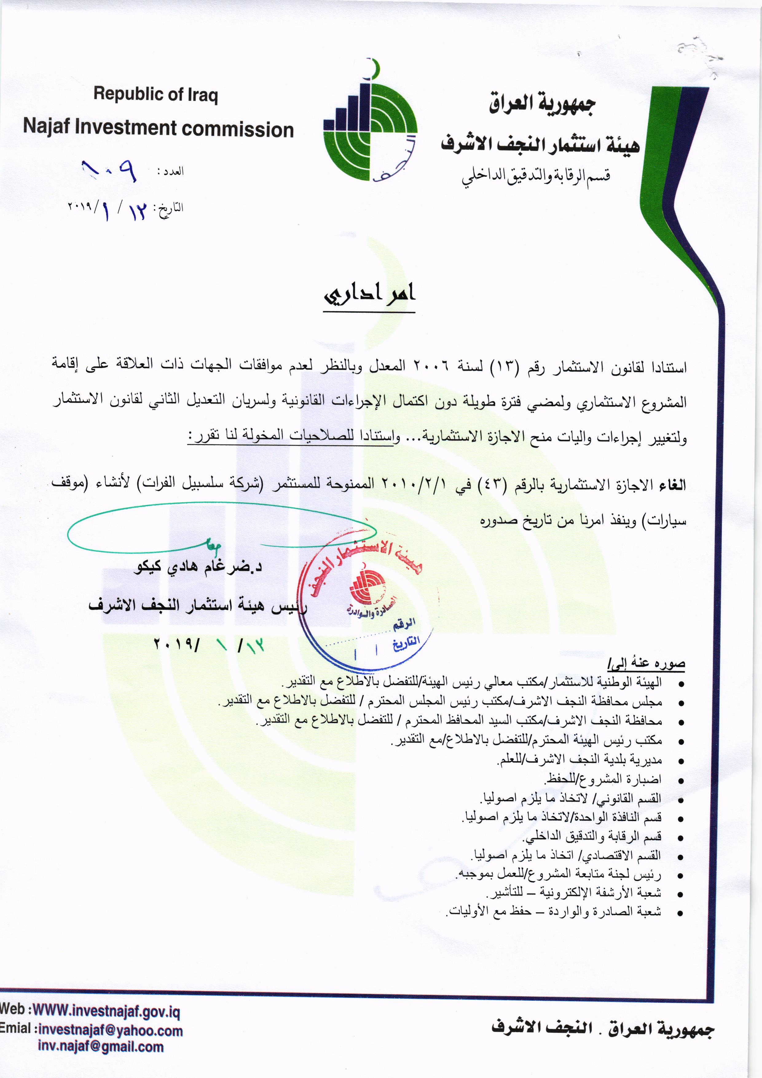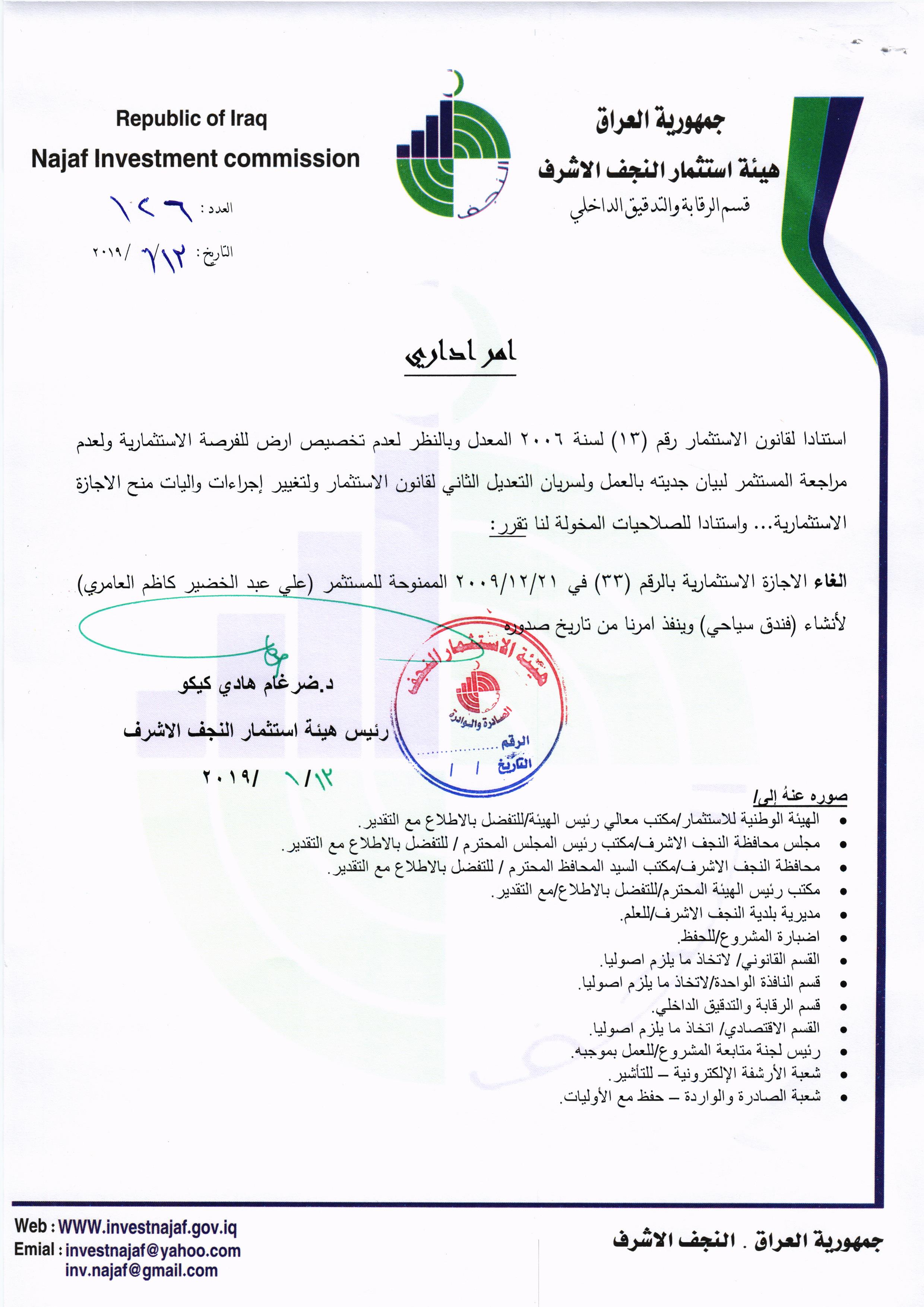 ومن اجل تحقيق العدالة وتطبيق القوانين, لذا تُهيب هيئة استثمار النجف الأشرف بكافة الاخوة من اصحاب الاجازات الاستثمارية التي منحت لهم دون تخصيص الارض لها في عام ٢٠٠٨ ؛ ٢٠٠٩ ؛٢٠١٠ مراجعة مقر الهيئة خلال مدة لاتتجاوز الثلاثة ايام من اجل تبليغهم بما بُتَّ بشأنهم من قرار بسحب تلك الاجازات وحسب القوانين النافذة وما يملك رئيس الهيئة من صلاحيات .