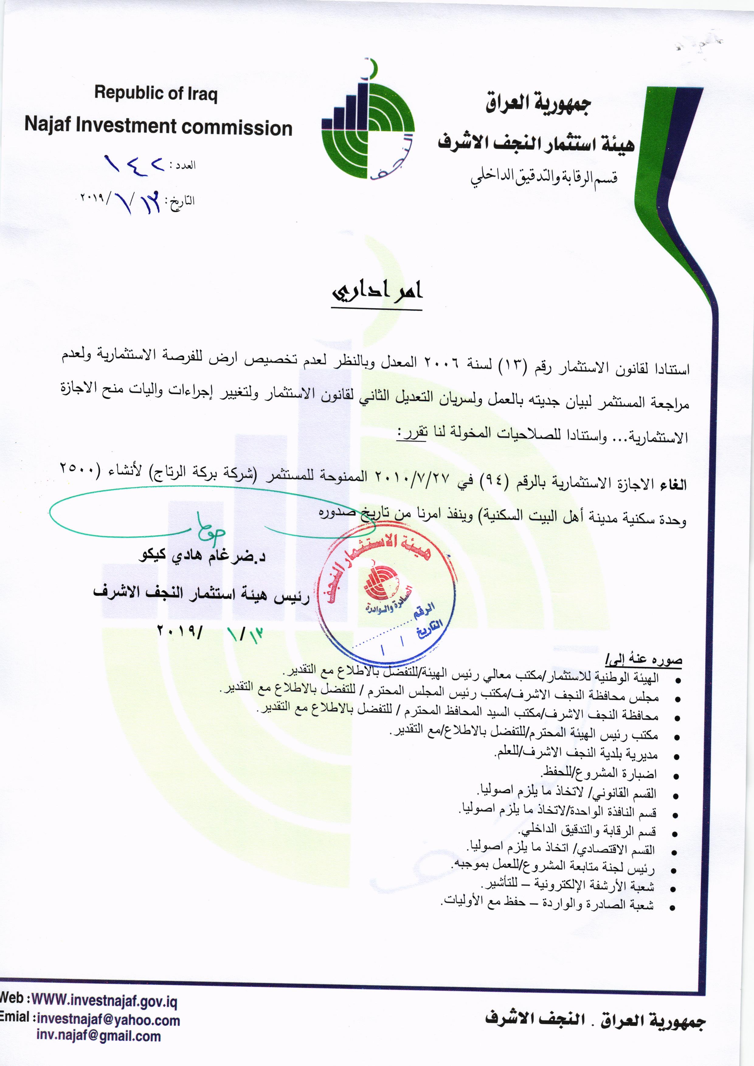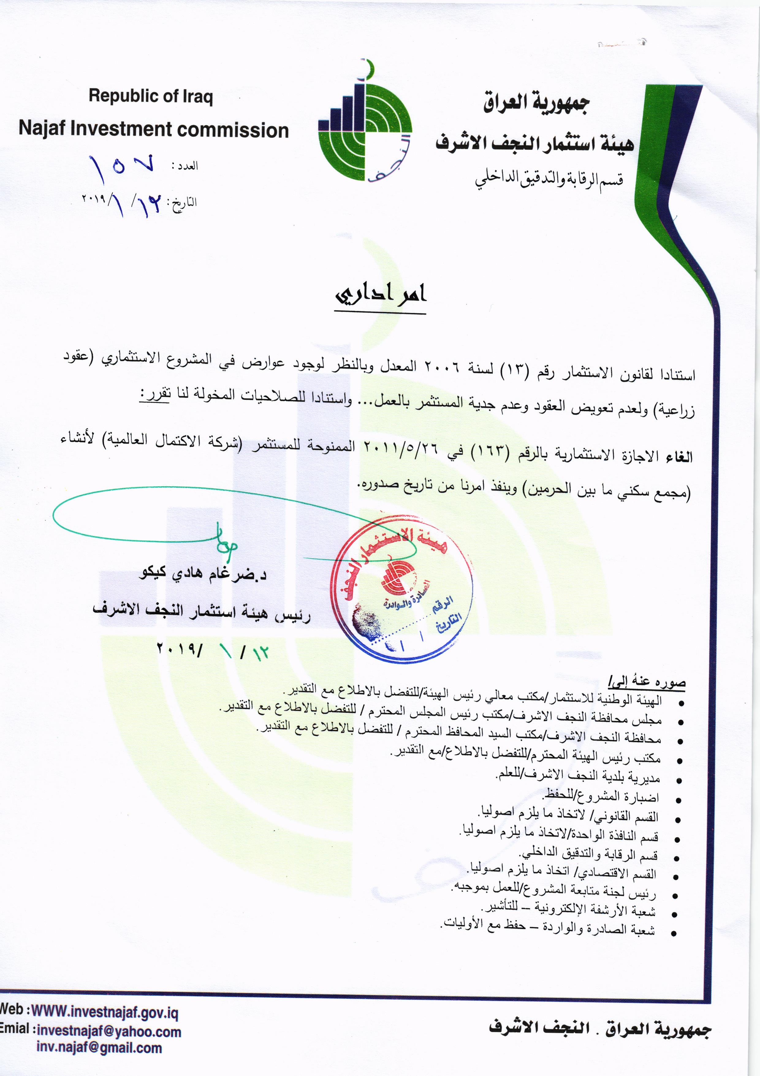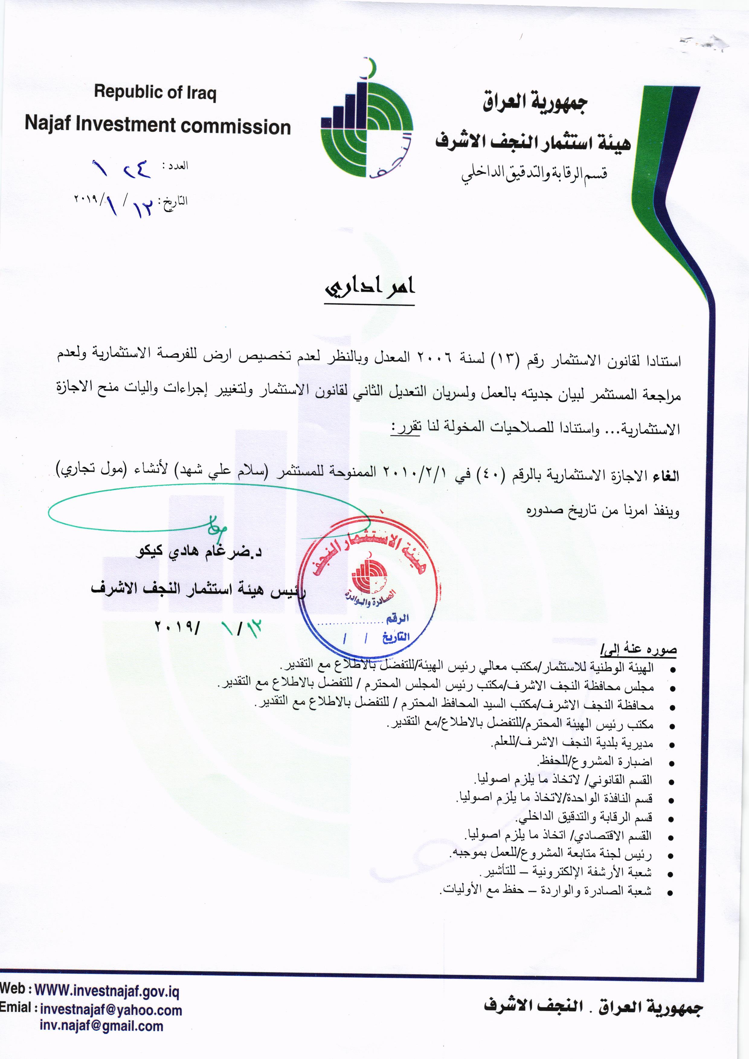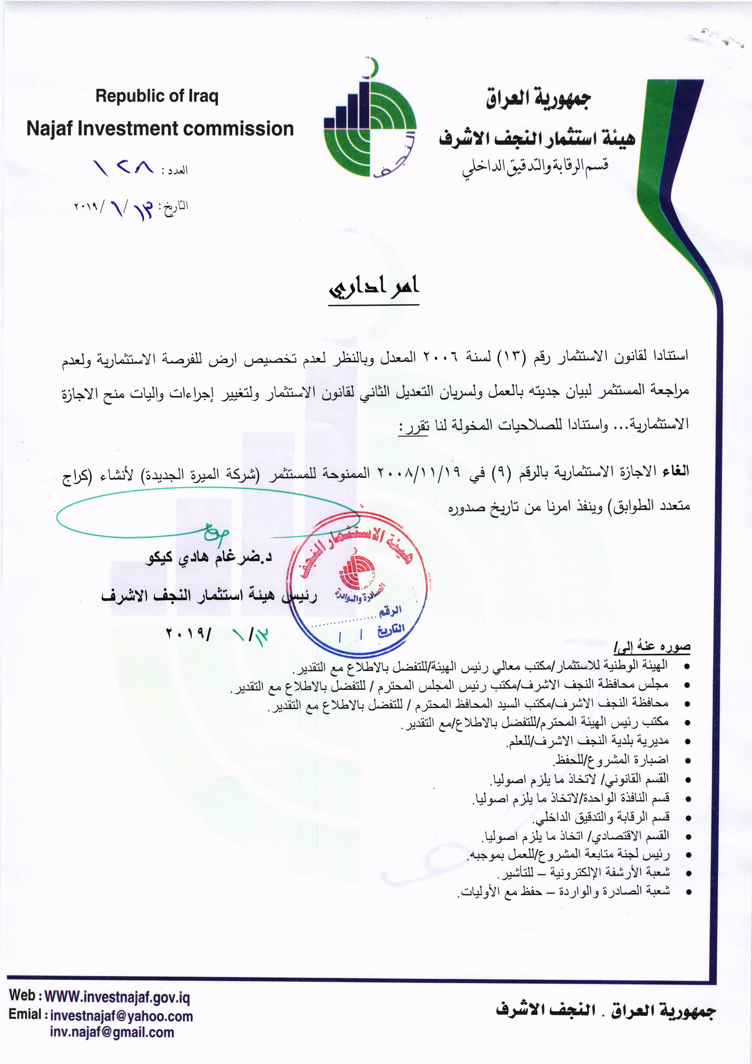 هيئة استثمار النجف الاشرف ومنذ اليوم الأول الذي تسنم فيها “الدكتور ضرغام هادي گيگو” مهام عمله اخذت على عاتقها النهوض بالواقع الاقتصادي في المحافظة من خلال تصحيح المسارات والعمل على خلق البيئة الخصبة للمستثمرين ووضع الدراسات والخطط المستقبلية التي من شأنها تقويم العملية الاستثمارية في المحافظة ومن اجلها لم تَدَّخِر الهيئة جهداً وبعناوينها كافة وراحت تواصل العمل ليل نهار من اجل تحقيق ما رسمت لها من اهداف , وبذات الوقت كانت الهيئة الداعم الرئيس للاخوة المستثمرين من خلال الوقوف على جميع ما كان يعترضهم من معوقات فدأبت على حلها وبشكل فوري، وهذا مع تبسيط الاجراءات الضرورية والحد من الروتين في استحصال الاجازات الاستثمارية وحسب المتعلق بها ادارياً وفنياً، وبالرغم من كُل ذلك وللاسف الشديد وجدنا بعض الاخوة من اصحاب الشركات والمستثمرين ومع كل ما قدم لهم من دعم وعلى المستويات كافة وبما يتماشى مع روح قانون هيئة الاستثمار النافذ ان اصبحوا غير آبهين بالقوانين لا بل اصبحوا مُهونين لكل اجراءٍ يتخذ بحقهم , فذهب البعض من اصحاب المشاريع بعدم الجدية في العمل ولم يُحَسِّن من اداءِ عمله وبقى على ذات التلكوء , فيما أستمر قسماً من تلك المشاريع دون تنفيذ على الرغم من تبليغهم وانذارهم انذاراً اولياً ومن ثم انذاراً نهائياً، ومع هذا فقد همشوا القوانين والقرارات والتعليمات الموجهة اليهم من هيئة الاستثمار،