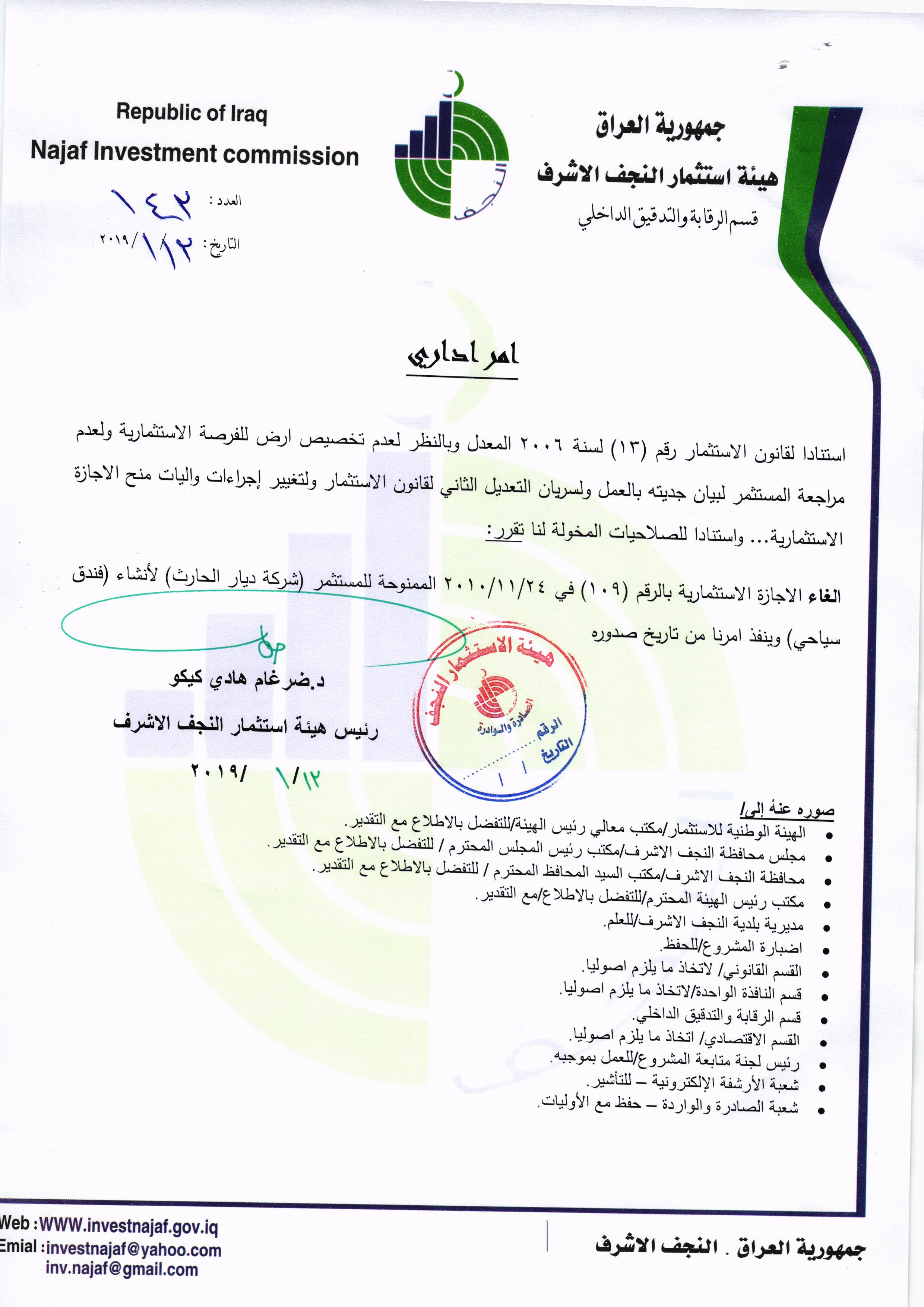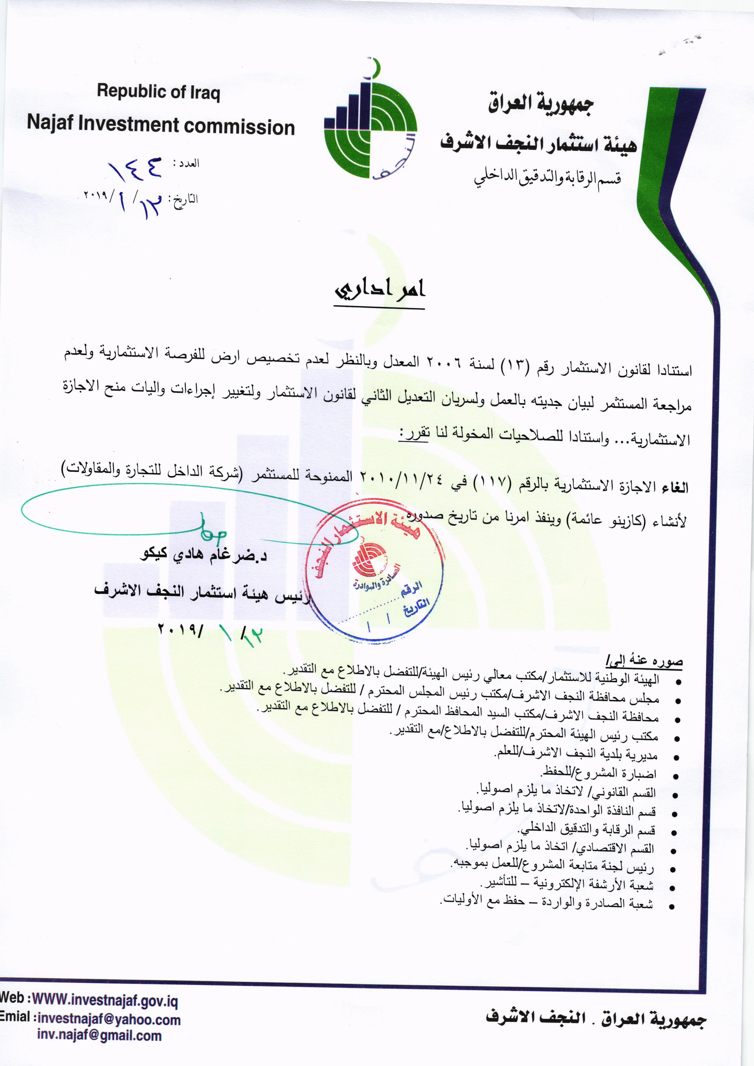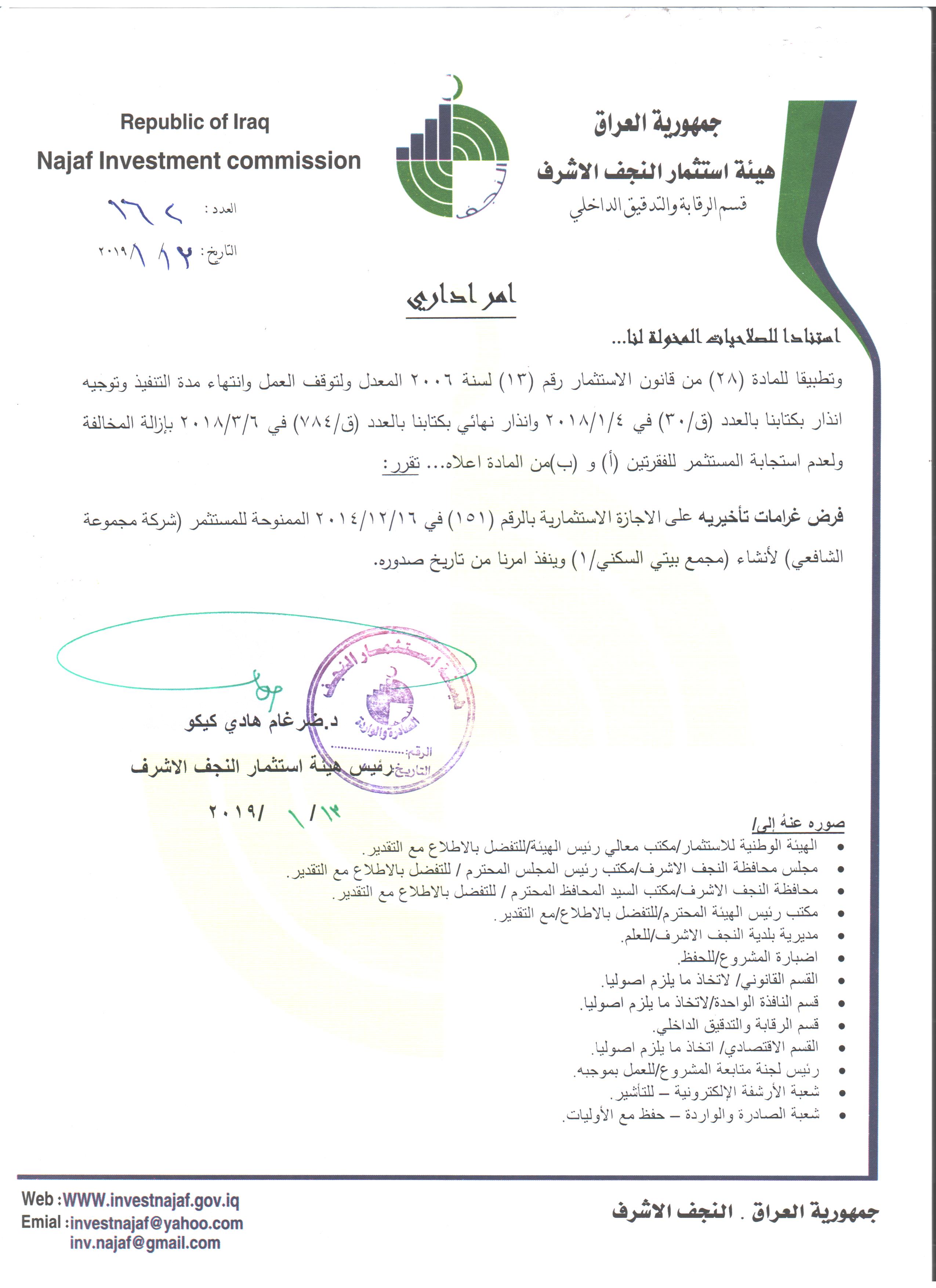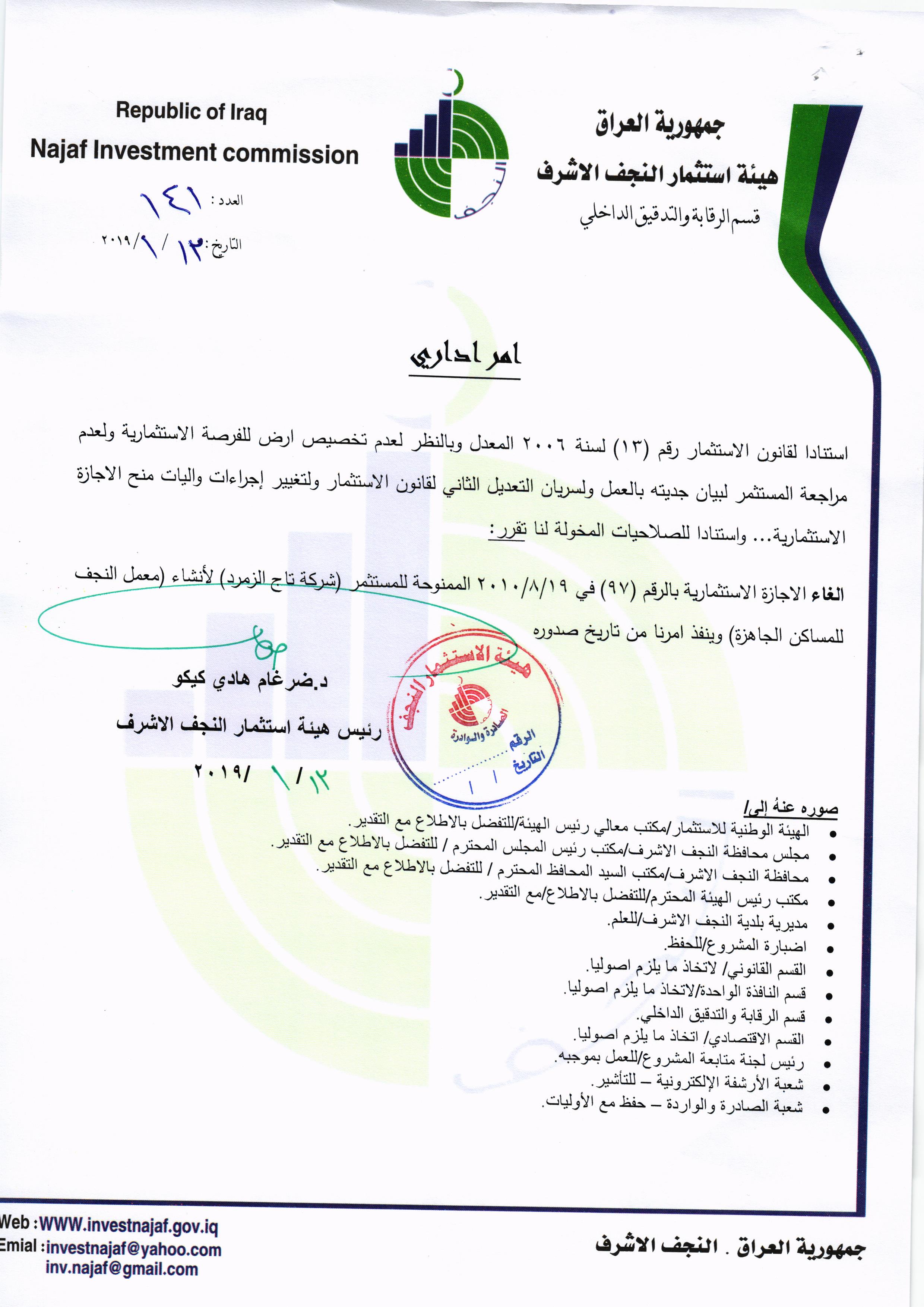 اجراءات عقابية صارمة بحق 97 مشروعا متلكا اتخذتها هيئة استثمار النجف و اشادات من قبل جهات اعلامية وحكومية