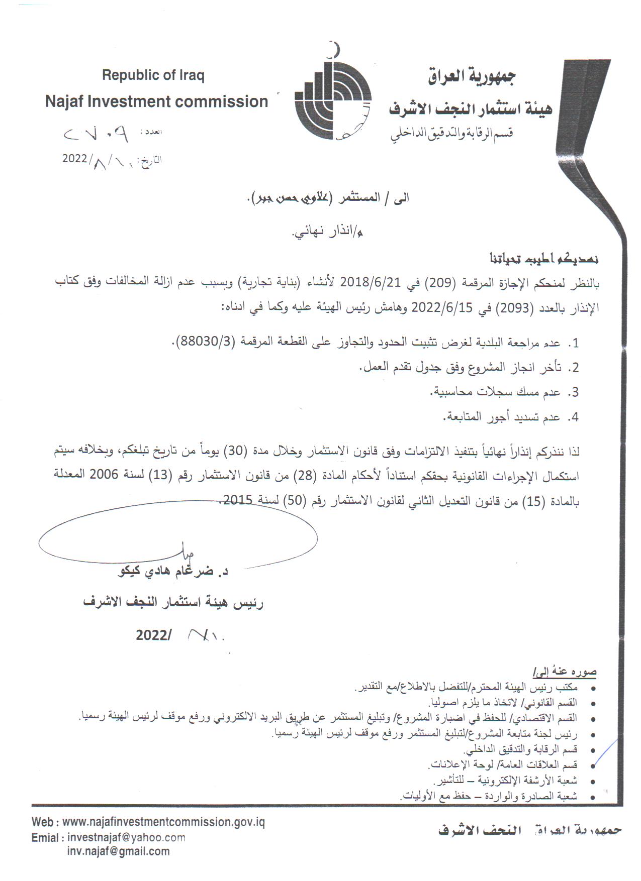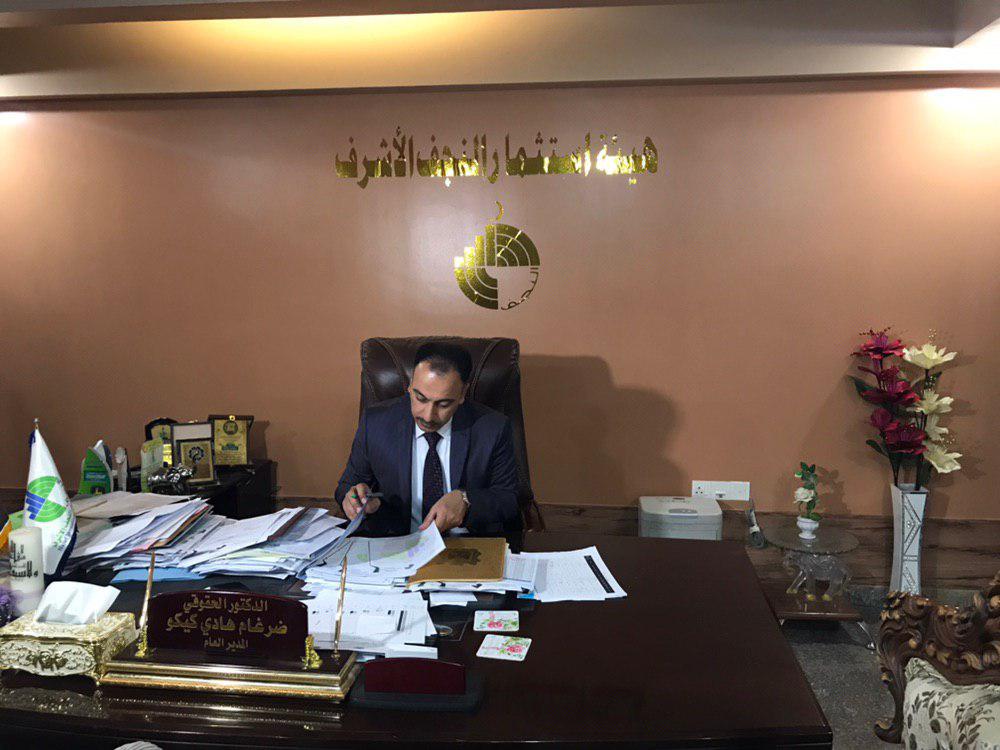 رئيس الهيئة الدكتور الحقوقي ضرغام گيگو زار موقع المشروع واطلع على سير الاعمال في القرية السكنية التي تقع في حي النداء شمال مدينة النجف الاشرف في القطعة المرقمة 3/88269 – مقاطعة 4 وعلى مساحة بلغت ١٦٠ دونم .