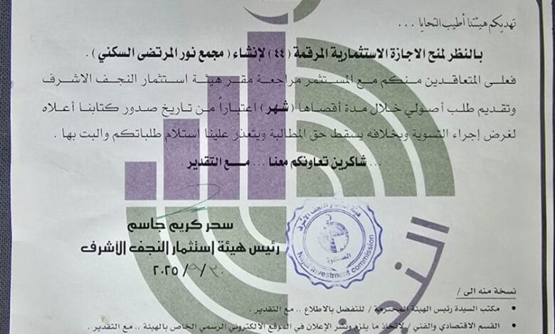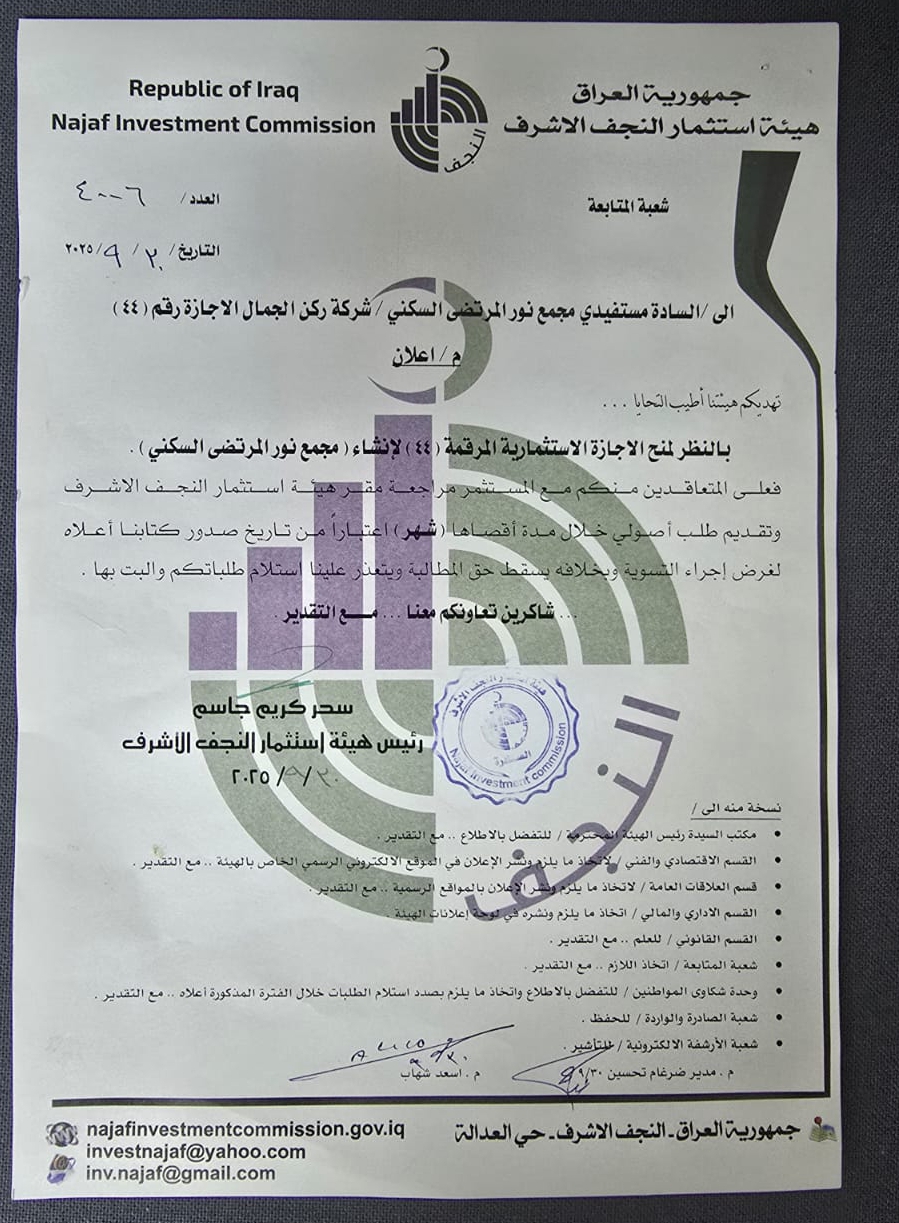 بالنظر لمنح الاجازة الاستثمارية المرقمة ( ٤٤ ) لإنشاء ( مجمع نور المرتضى السكني ) .