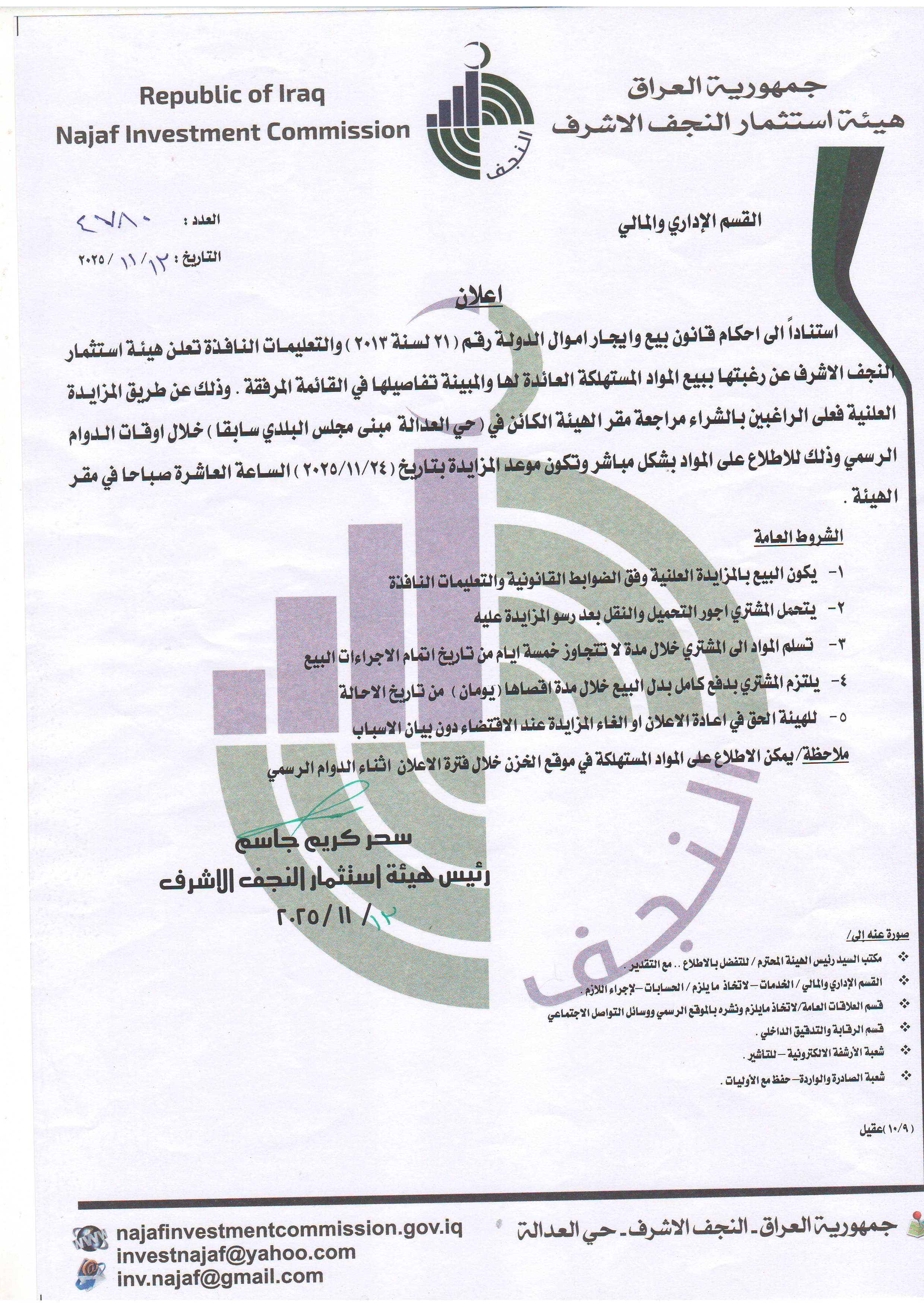 اعلان بيع المواد المستهلكة العائدة لها